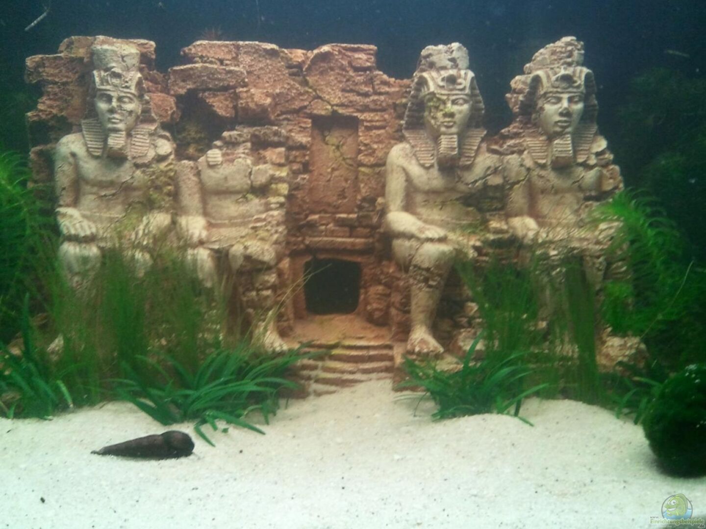 Aquarium mit gebogener Frontscheibe, Glas geschliffen und poliert. Der Cube bietet eine beeindruckende Tiefe, so steht der Abu Simbel relativ mittig, dahinter ist ein recht dichter ´Wald´.