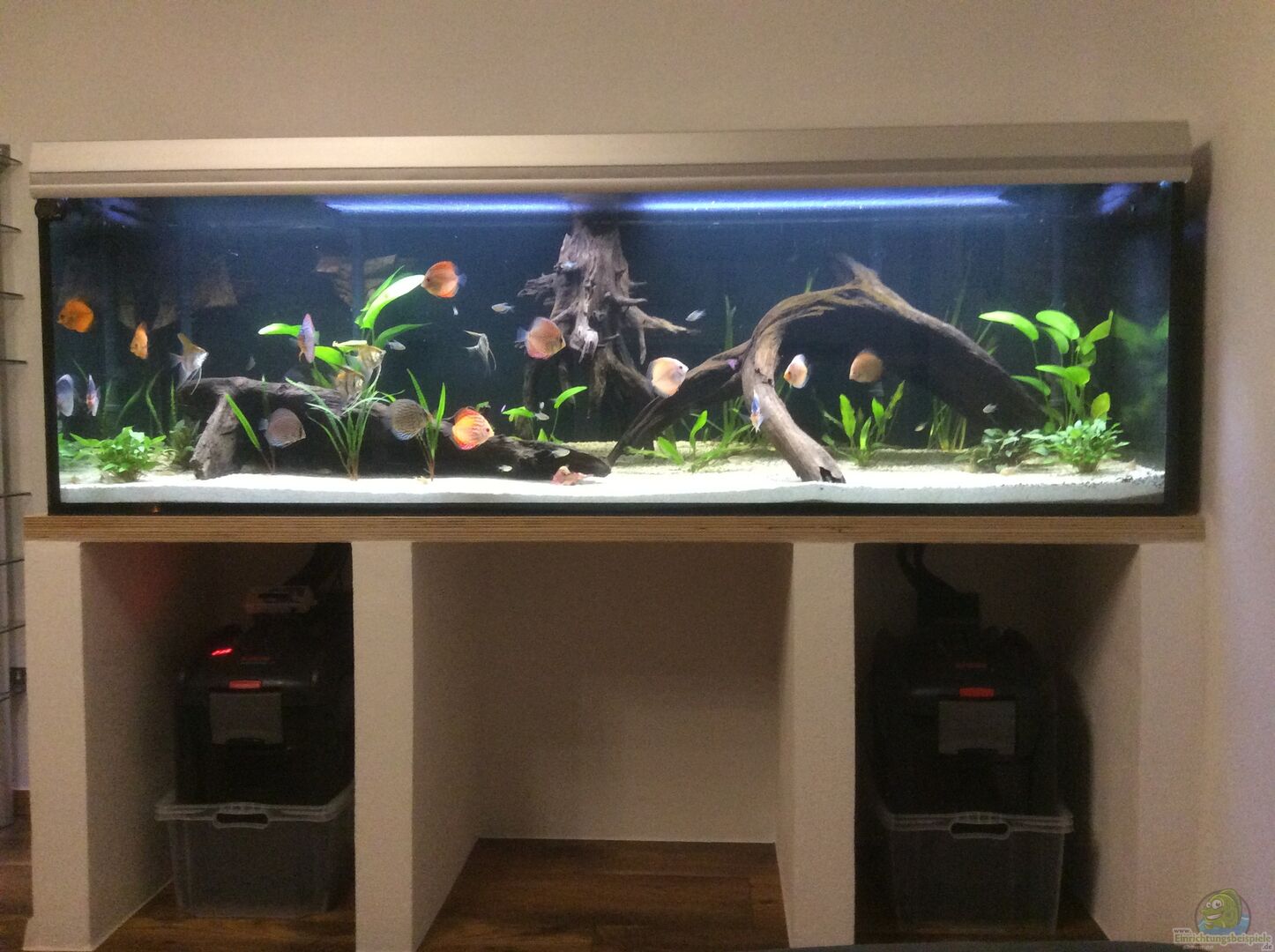 Der Unterbau wurde mit Ytong-Steinen im Verbund gemauert und ganzflächig ein Armierungsgewebe eingearbeitet um Risse zu vermeiden. Auf die fertige Konstruktion wurde eine Mehrschichtholzplatte aus 2 verleimten 28mm starken Platten aufgesetzt. Die Platte wurde mit Klarlack versiegelt. Der Ytong Unterbau wurde zum Schlu?? mit Kalk-Gipsputz verputzt. Das Becken stammt ursprüglich von www.diamantaquarien.de und hat eine Aluminiumabdeckung. Die Rückwand und die rechte Seitenwand wurde [...]