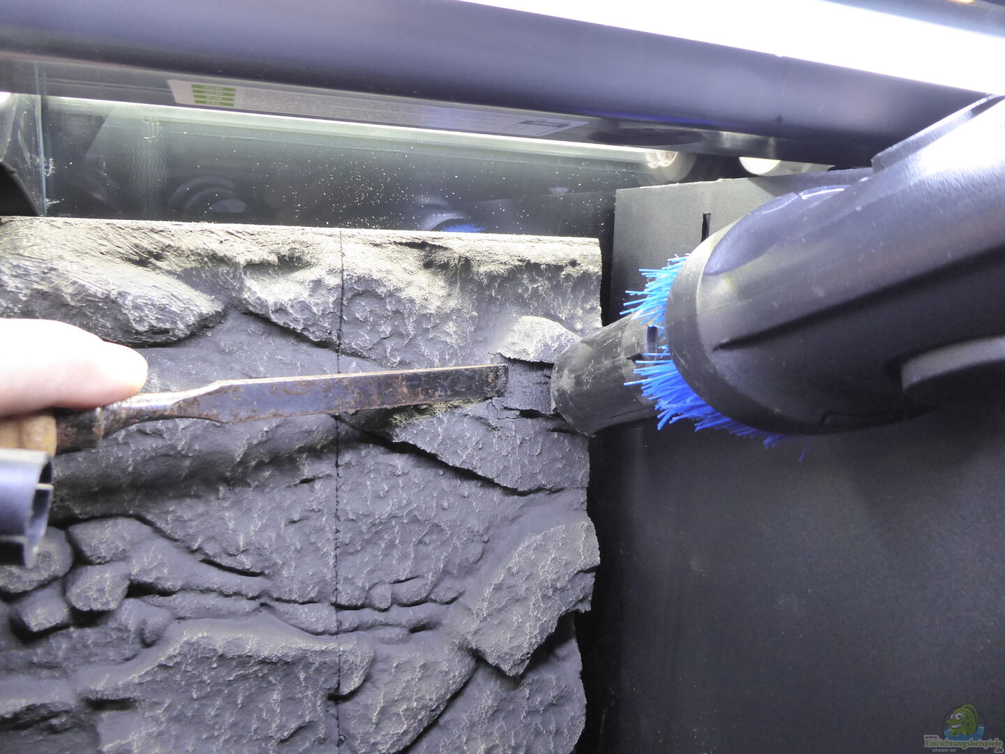 Als Rückwand benutze ich die "Stone Granit" von Juwel. Diese habe ich dann mit einem standard Aquarienkleber befestigt. Auf den Boden habe ich eine 2mm Plexiglasscheibe gelegt, damit das Glas nicht durch die Steine beschädigt wird. Die Platte am besten vor der Rückwand einsetzen. ich bekam die Platte nicht mehr rein und habe sie in der mitte geteilt. Beim Einkleben der Rückwand habe ich ca. 1cm Abstand vom boden gelassen. Da dies mein zweites Becken ist, habe ich die Filtermedien [...]