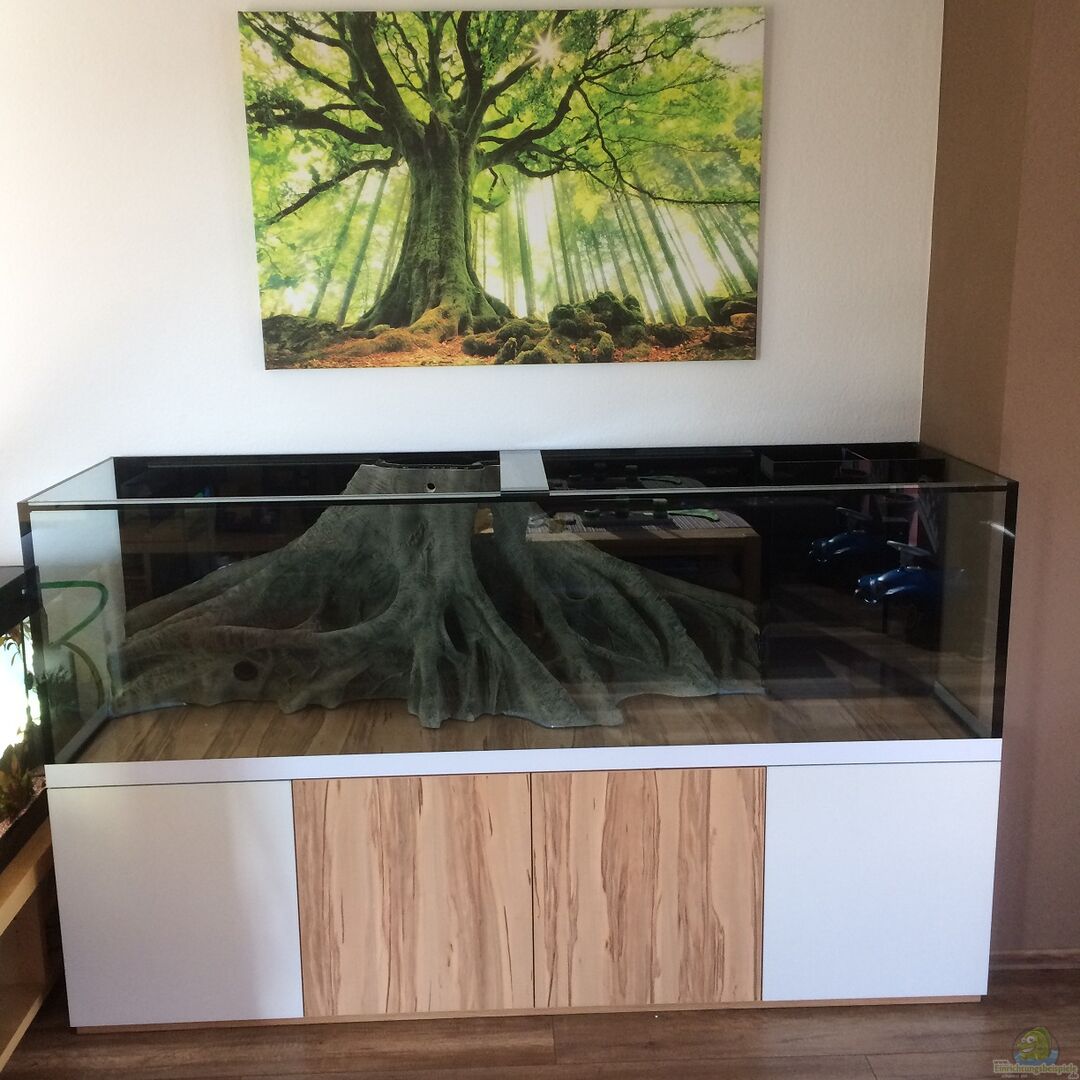 Komplettaquarium von Emmel Aquarienbau (siehe unten) 2 Bodenbohrungen hinten mittig für Topffilter inkl. Bypass für Wasserwechsel 4-Kammer Biofilter hinten rechts Rainforrest Root L von AFStyle restliche Rückwand schwarz foliert Kiesblende wei?? foliert