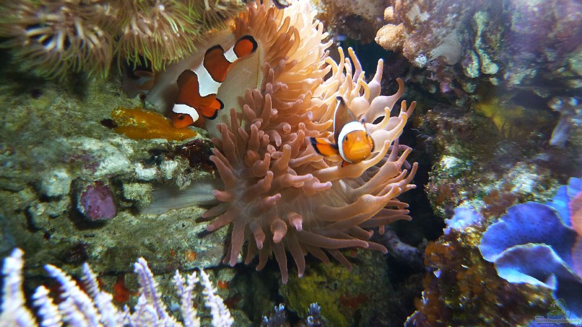 Hier findest du alle wichtigen Infos zur Haltung und Beispiele für die Einrichtung eines Aquariums für Amphiprion perideraion (Halsband-Anemonenfisch).