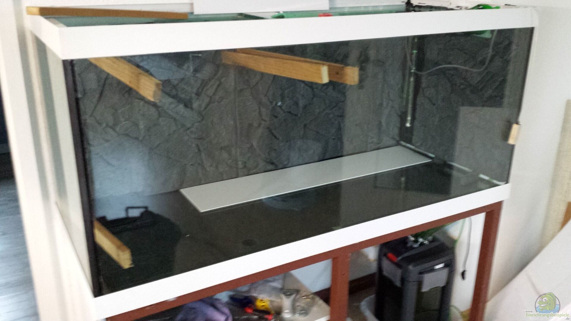 Ca. 100 Kg Basaltbruch aus einem Steinbruch hier ganz in der Nähe. Nur mit dem Hochdruckreiniger vor der Einbringung gereinigt. Die Steine sind in der rechten Ecke bis knapp unter die Wasseroberfläche vor der Rückwand gestapelt. Als Unterlage für die Steine dient eine 5mm Hartschaumplatte auf der noch eine 1 CM Styroporplatte liegt. Rückwand sind 3 Teile Juwel Granit Stone an der Rückwand und rechten Seite mit Silikon verklebt. Passt hervorragend zum der Farbe des Basaltsteins.