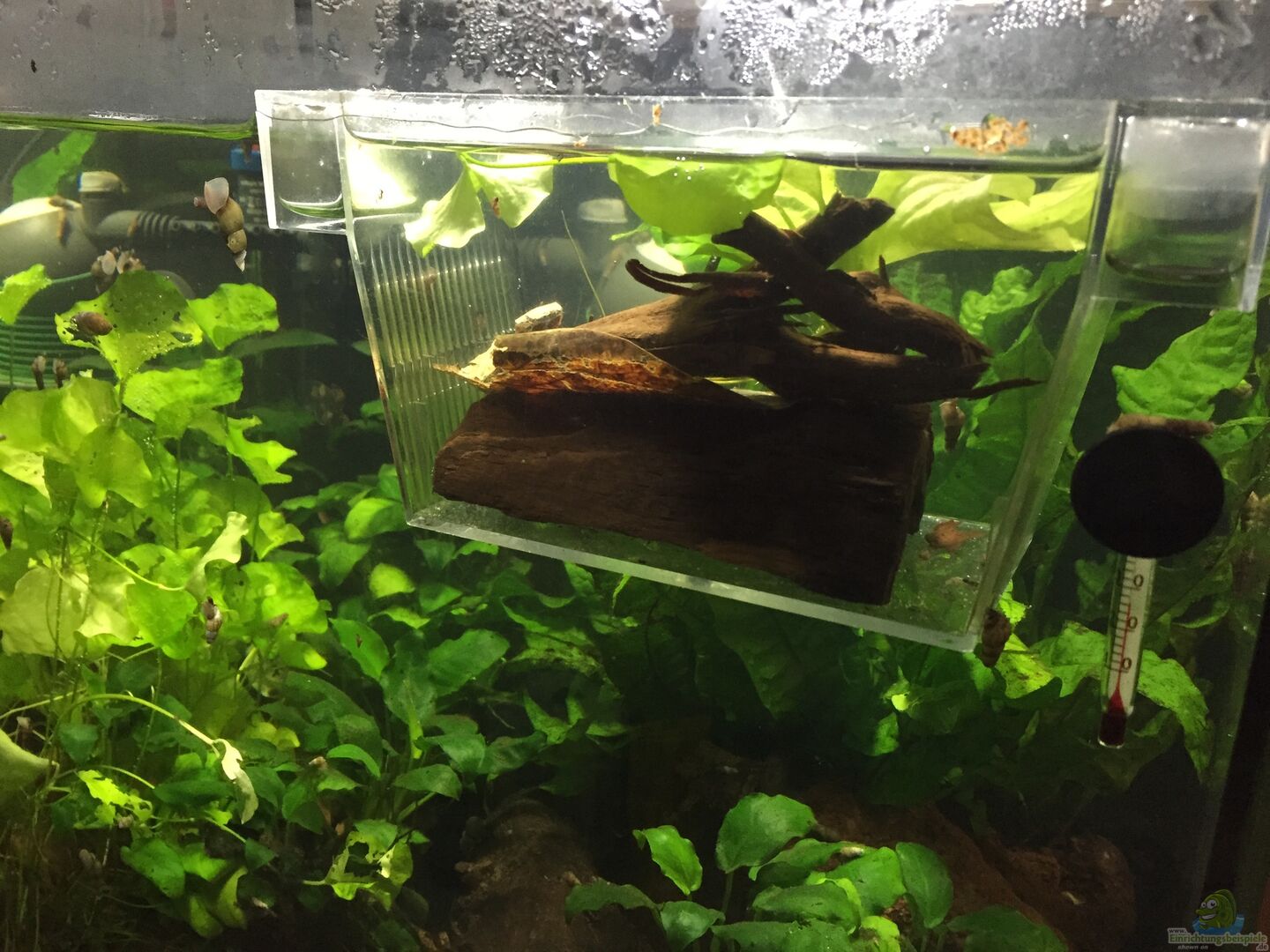 Es handelt sich um ein Standardaquarium ohne Besonderheiten. Die Abdeckung besteht aus einer Plexiglasplatte, die im Zweifel einen Fluchtversuch der Frösche aufhalten soll. Ursprünglich war dies mein Quarantänebecken und die ersten Bewohner, die in Quarantäne gekommen sind, sind sogleich drin geblieben :-D ... also ade Quarantänebecken