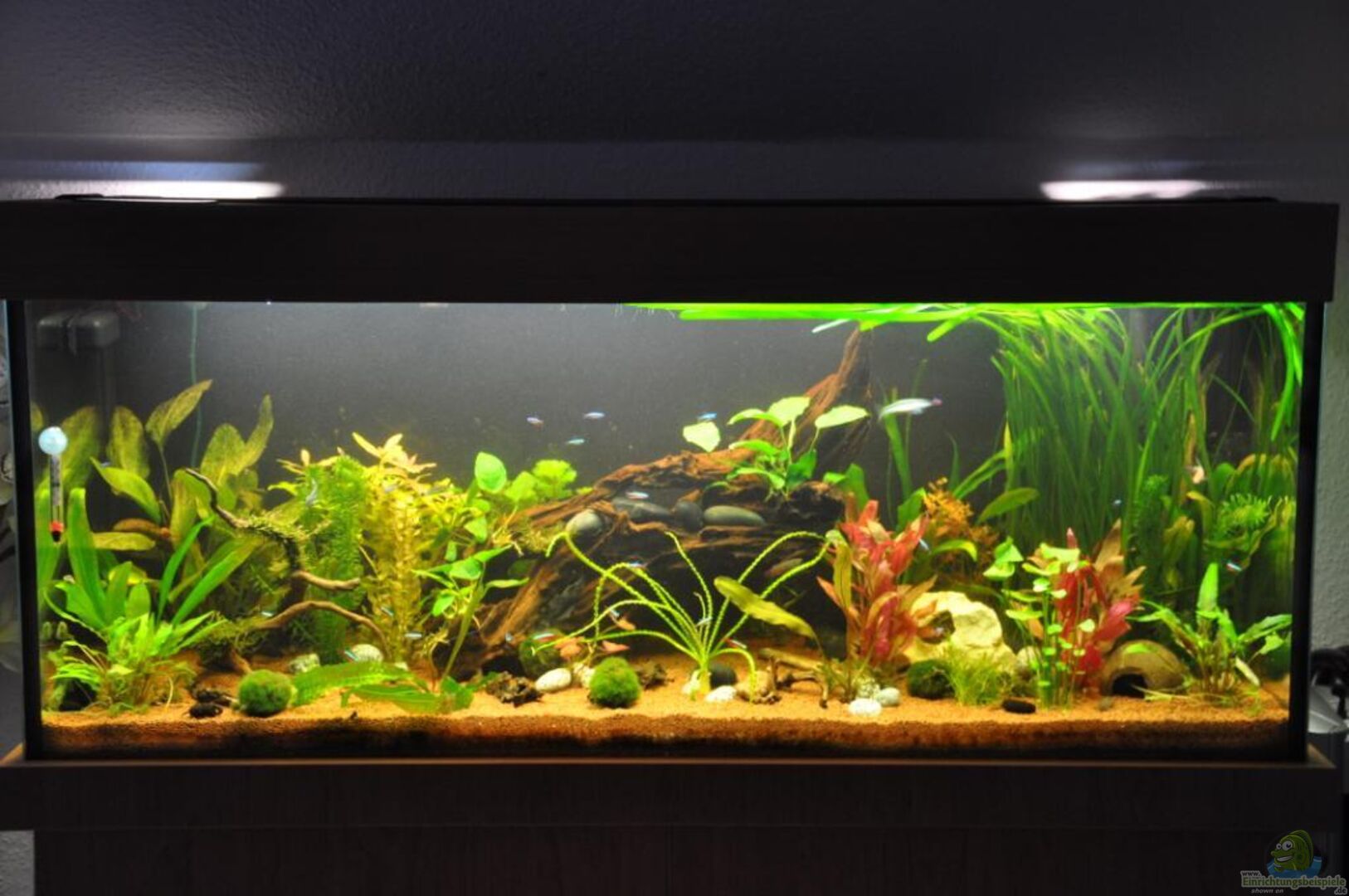 Als Hintergrund wurde schwarze Folie geklebt. Die Abdeckung ist von Juwel. Der Unterschrank wurde angefertigt und ist nur 40cm hoch, da das Becken unter einer Schräge steht.
