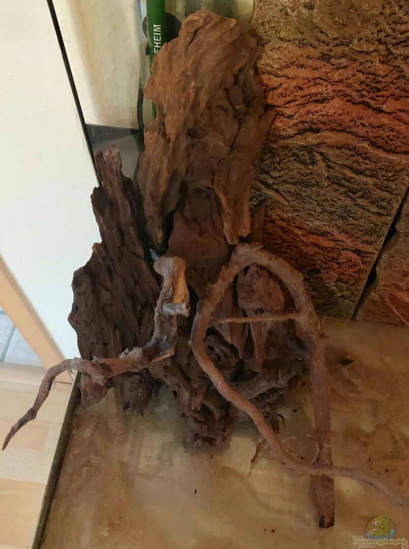 15x Moorkienwurzeln: Damit erfolgte die Nachbildung eines ins Wasser gefallenen großen Astes (rechte Seite). Sowie die Nachbildung eines kleinen Baumstamms (linke Seite) 1x großer Stein Seemandelbaumblätter: Schwankende Anzahl in unterschiedlichen Größen. Verleihen dem Aquarium ein natürliches Aussehen. 2x Rückwand JUWEL Cliff dark