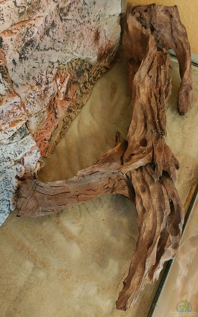 15x Moorkienwurzeln: Damit erfolgte die Nachbildung eines ins Wasser gefallenen großen Astes (rechte Seite). Sowie die Nachbildung eines kleinen Baumstamms (linke Seite) 1x großer Stein Seemandelbaumblätter: Schwankende Anzahl in unterschiedlichen Größen. Verleihen dem Aquarium ein natürliches Aussehen. 2x Rückwand JUWEL Cliff dark