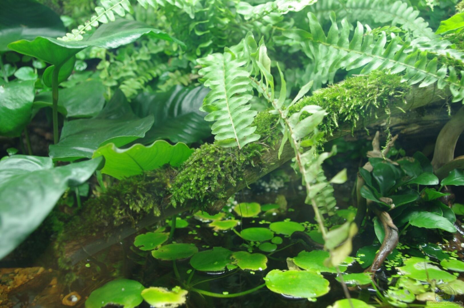 Das Becken ist ein Riparium und soll soweit es geht einen Uferabschnitt des afrikanischen Regenwaldes darstellen. Die Rückwand besteht aus Zement, Sand und Torf im Verhältniss 1:2:4. Dieses Material wird auch im Terrarienbau verwendet. Vorteil ist eine grobe, porige Struktur die Feuchtigkeit speichert und somit das Bepflanzen einfacher macht, insbesondere sollen Moose besser anwachsen.