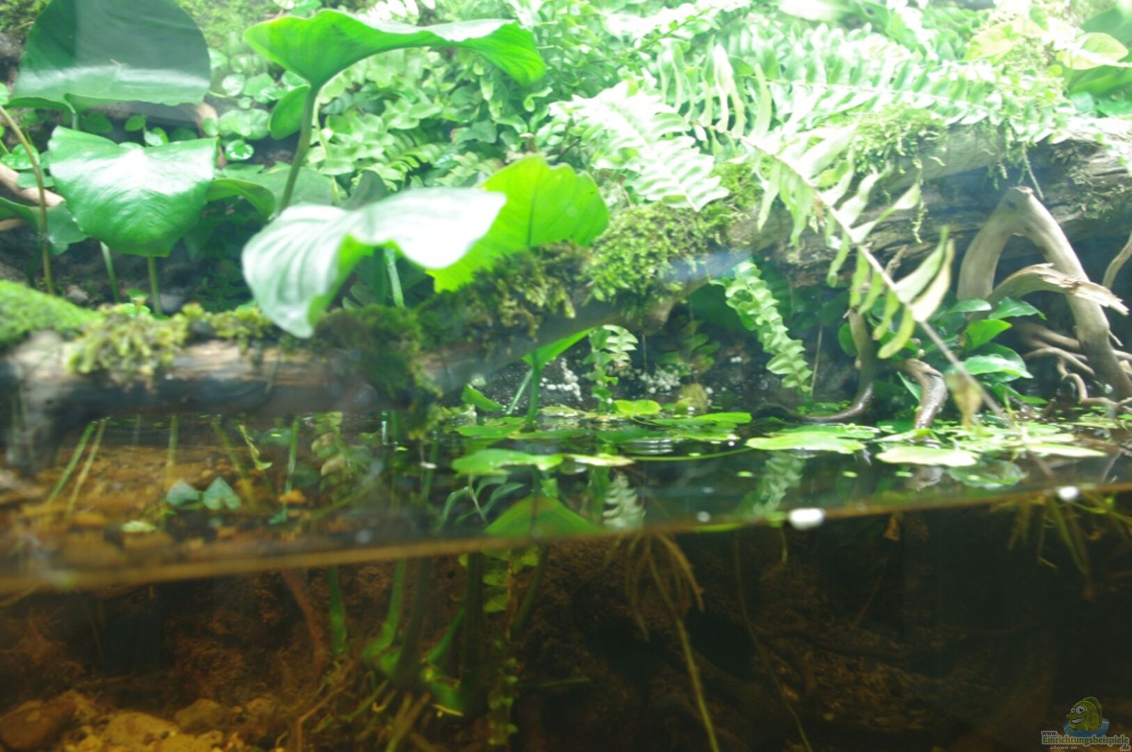Das Becken ist ein Riparium und soll soweit es geht einen Uferabschnitt des afrikanischen Regenwaldes darstellen. Die Rückwand besteht aus Zement, Sand und Torf im Verhältniss 1:2:4. Dieses Material wird auch im Terrarienbau verwendet. Vorteil ist eine grobe, porige Struktur die Feuchtigkeit speichert und somit das Bepflanzen einfacher macht, insbesondere sollen Moose besser anwachsen.