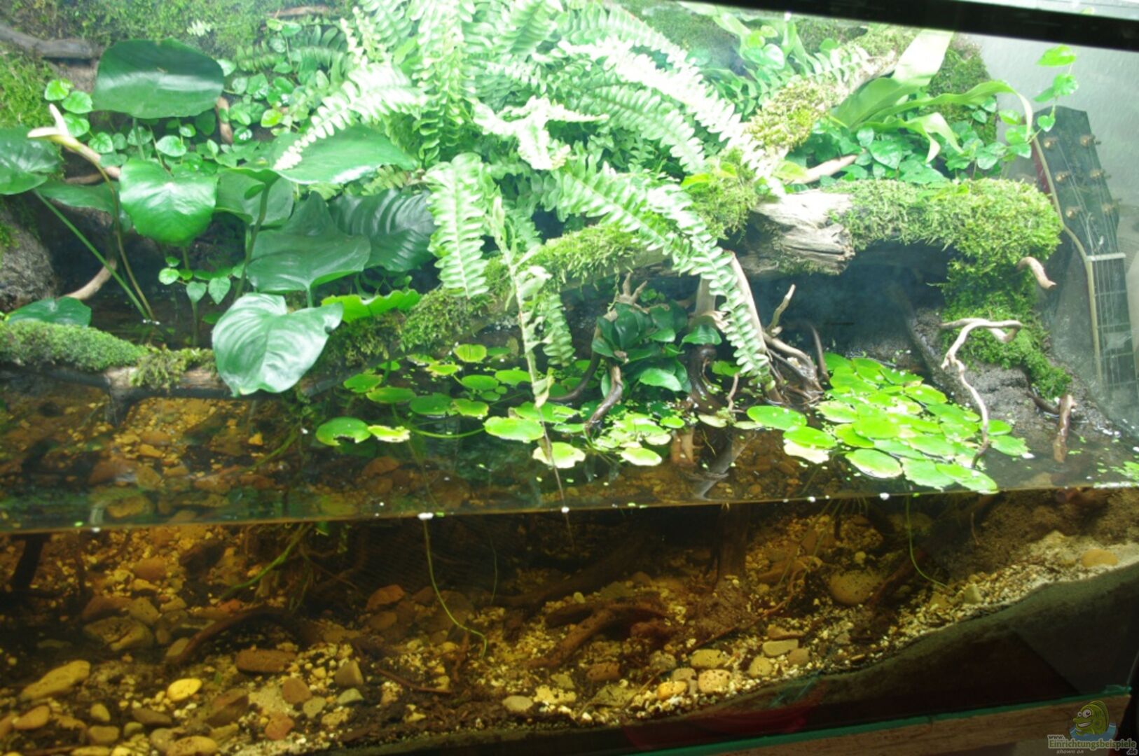 Das Becken ist ein Riparium und soll soweit es geht einen Uferabschnitt des afrikanischen Regenwaldes darstellen. Die Rückwand besteht aus Zement, Sand und Torf im Verhältniss 1:2:4. Dieses Material wird auch im Terrarienbau verwendet. Vorteil ist eine grobe, porige Struktur die Feuchtigkeit speichert und somit das Bepflanzen einfacher macht, insbesondere sollen Moose besser anwachsen.