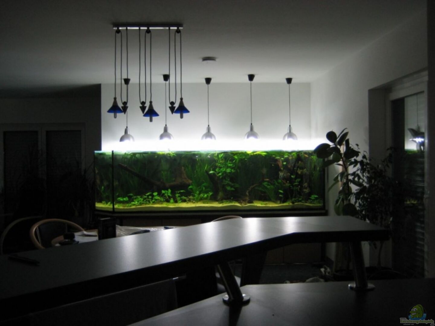 3 Bohrungen, Ablaufschacht (geräuschlos), 20er VSG-Glas, umlaufender Glasstreifen am Boden, Bodenplatte 2-fach geteilt. Volumen ist incl Filterbecken! Wasserwechsel erfolgt über einen Ablauf. Rückwand aus 5cm Styropor, mit Hei??luftfön strukturiert und mit schwarzem Lack besprüht, dient gleichzeitig als Wärmedämmung. Das ganze steht auf einem Stahlgestell, vom Küchenbauer verkleidet.