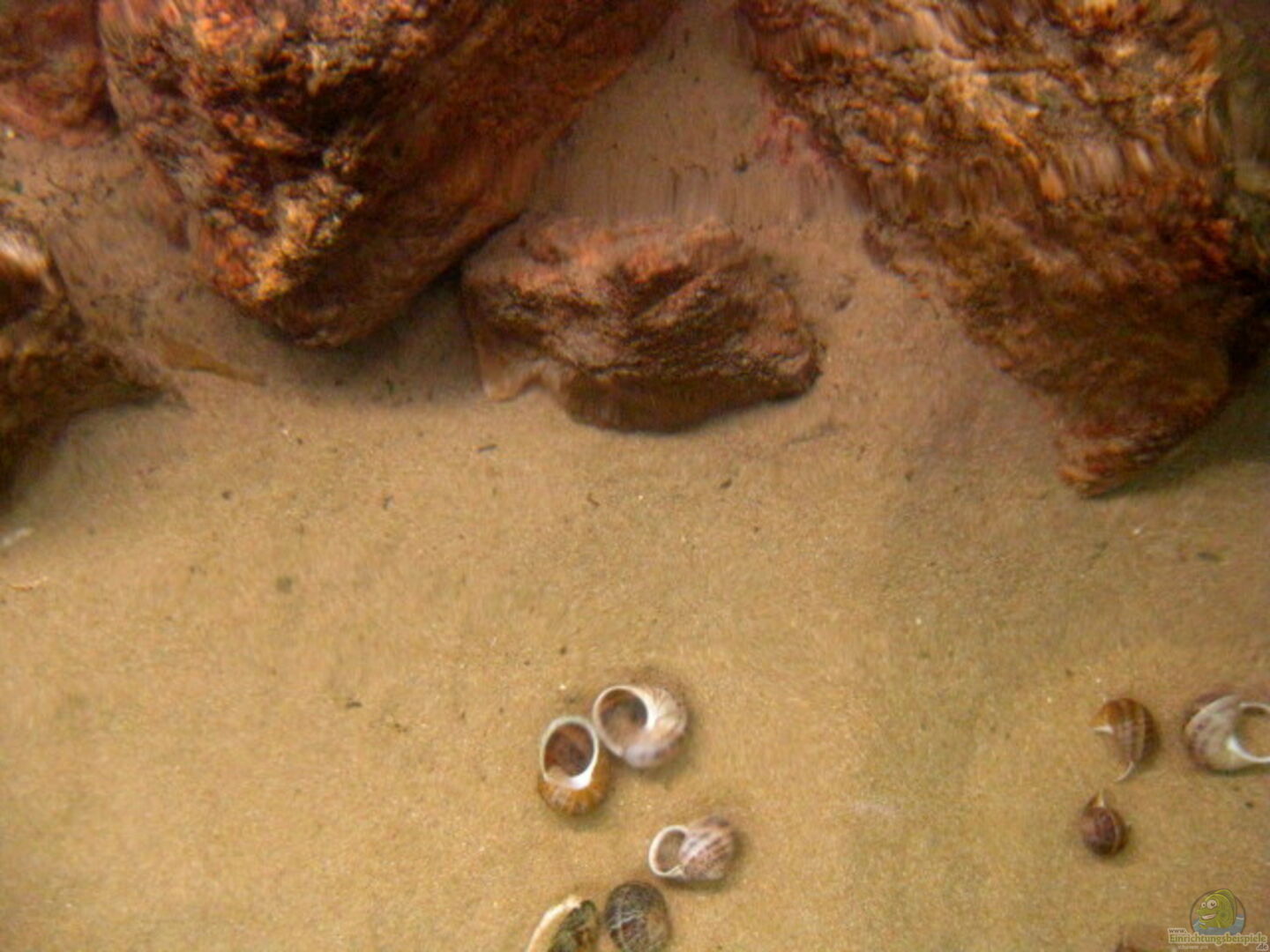 Sandstein ca. 60 kg, Gehäuse der Neothauma-Schnecken und einige Weinbergschnecken. Unter den gro??en Steinen liegt zum Schutz der 14 mm Bodenplatte, nochmals eine 2 cm starke Styroporplatte. Die Steine können so nicht von den Fischen untergraben werden. Selbstgebaute Rückwand aus Polyethylenschaum mit beiger Farbe bestrichen, mit Sand ungleichmä??ig abgestreut und mit mattem Klarlack versiegelt. Die Rückwand hat eine Tiefe zwischen 2 und 12 cm. Sie kann auf der gesamten Länge [...]
