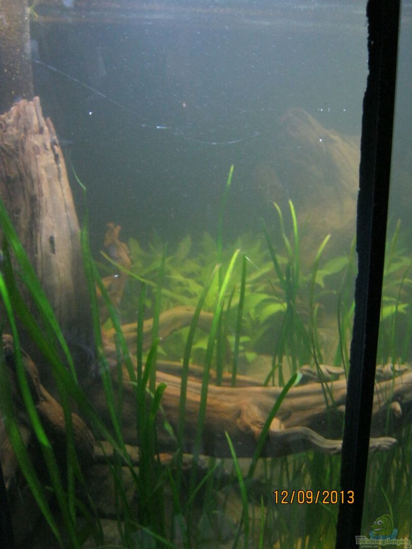 Das Aquarium ist aus 12mm Glas mit schwarzem Silikon verklebt. Bodenbohrungen sind nicht vorhanden. Das Becken steht auf einem 25 x 25 mm Stahlrohrgestell, unter dem Gestell eine 10mm Siebdruckplatte, auf der Unterseite mit Teppichboden beklebt um Unebenheiten in den Bodenfliesen auszugleichen. Auf dem Rohrgestell befindet sich eine 20 mm Spanplatte darauf eine Styroporplatte mit 10 mm Dicke. Die Rückwand und die linke Seitenscheibe sind mit einer schwarzen Folie beklebt und mit 10mm Styroporplatte [...]