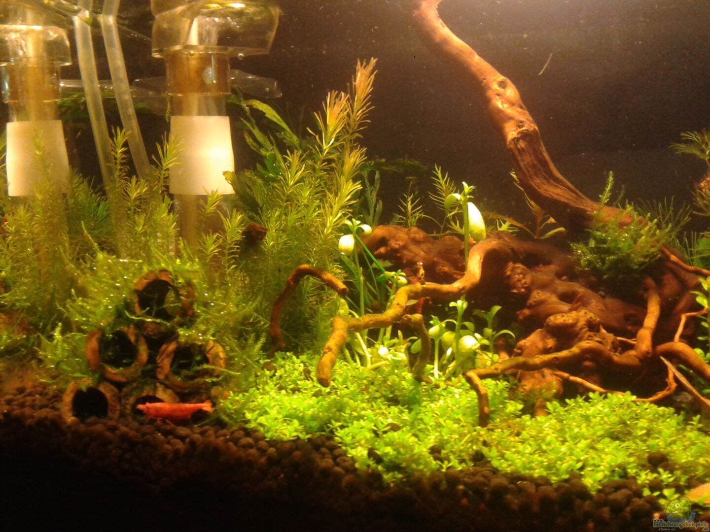 Zuchtbecken für Rote Taiwan Sakura Garnelen. Alle 3 Becken sind ein wenig im Aquascaping-Stil angelegt und sind durch den starken Pflanzenwuchs passend für die Bedürfnisse der Garnelen eingerichtet. Rückscheibe + eine Seitenscheibe sind für mehr Tiefenwirkung mit schwarzer Folie beklebt.