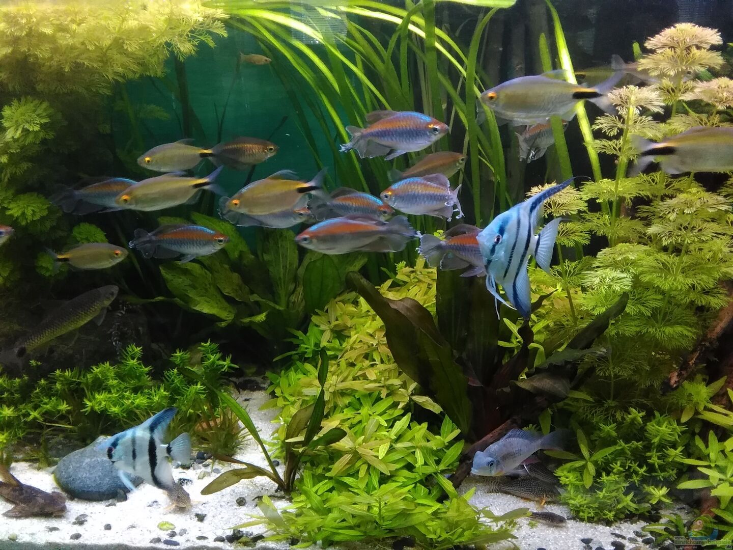 Juwel-Becken, 8 mm Float-Glas, Bodenscheibe 10 cmm Verkleidet von uns mit L-Aluschienen zur besseren Optik auf selbst gezimmertem Tisch, Filter stehen rechts und links