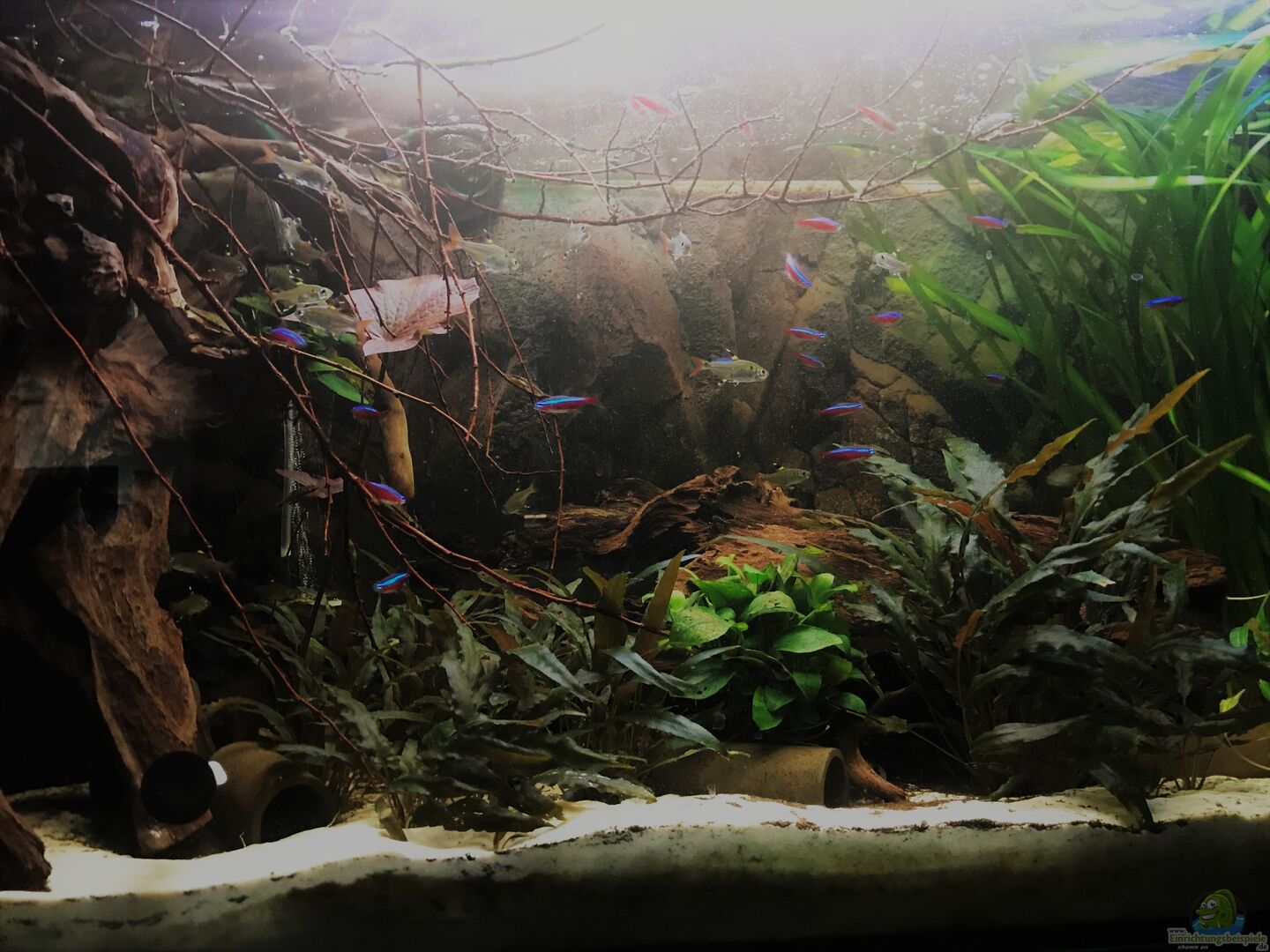 Sonderanfertigung von 110x50x50. Rechteckaquarium Der Unterschrank wurde selbst gebaut und in schwarz lackiert. Rückwand und Seitenscheiben wurden mit schwarzem Bastelkarton beklebt.
