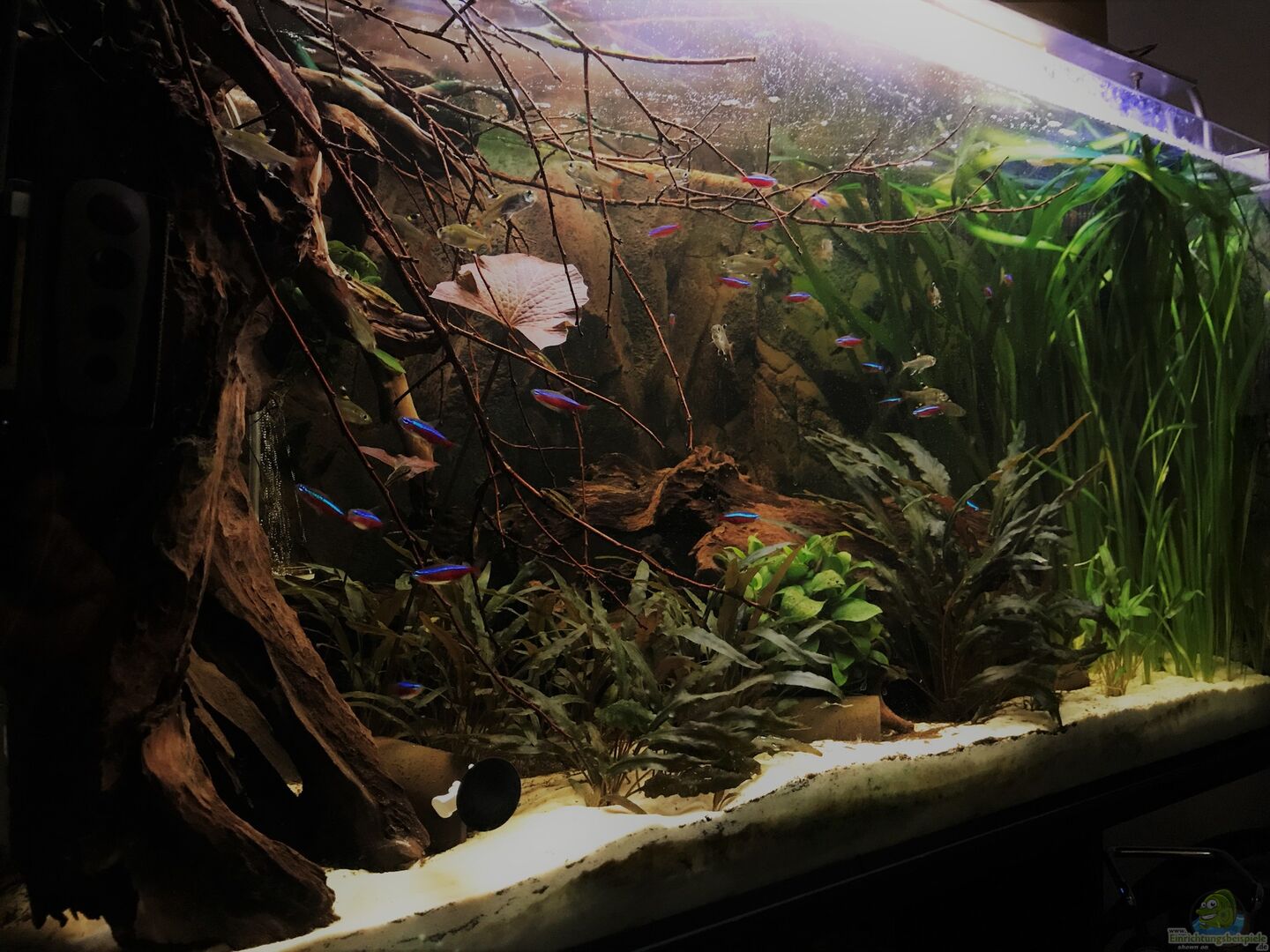 Sonderanfertigung von 110x50x50. Rechteckaquarium Der Unterschrank wurde selbst gebaut und in schwarz lackiert. Rückwand und Seitenscheiben wurden mit schwarzem Bastelkarton beklebt.