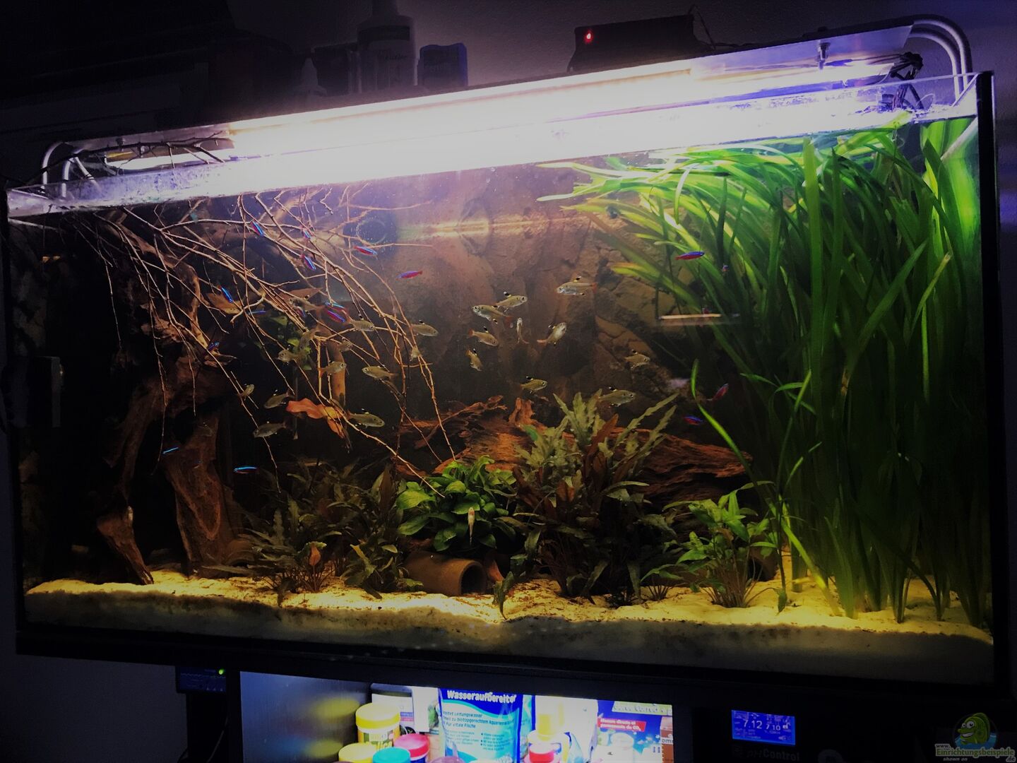 Sonderanfertigung von 110x50x50. Rechteckaquarium Der Unterschrank wurde selbst gebaut und in schwarz lackiert. Rückwand und Seitenscheiben wurden mit schwarzem Bastelkarton beklebt.