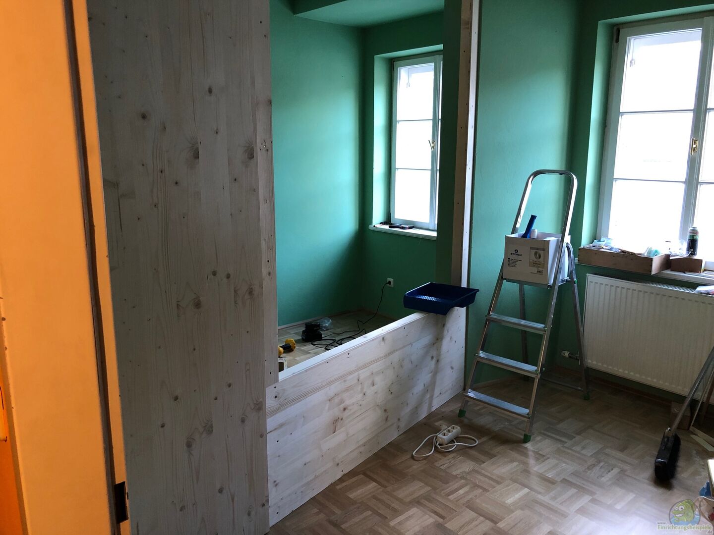 Das halbe Zimmer wird zum "Terrarium" mit ca. 6 Quadratmetern... Fichten-Vierkantholz ohne Astlöcher wurde für den Rahmen verwendet, der mit Fichten-Dreischicht-Platten verkleidet ist. Am Boden befindet sich (bald) ein "Plastik-Boden" (PVC), der den Parkettboden darunter schützen soll. Der Boden wird auf ca. 50cm in die Höhe an der Wand angemacht und stellt so eine "auslaufsichere" Wanne dar. Schon in den letzten zwei Jahren (vor dem Neubau des "Terrariums") [...]
