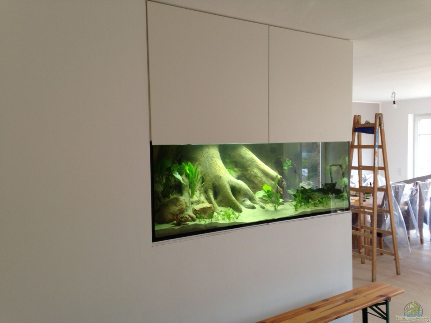 Das Becken ist nach unseren Ma??en gefertigt worden und hat einen eingebauten 4 Kammer Bio Filter. Es ist in die Wand eingelassen und steht im gleichen Raum wie die Heizungsanlage, womit wir problemlos das Becken (solargestützt) heizen können. Wasserablauf, Zulauf und Waschbecken sind direkt am Becken installiert. Als Unterbau habe ich die Wände mit Kalksandsteinen geklebt und mit einer dicken Betonplatte abgeschlossen. Der obere Teil des Aquariums ist mit drei Wie??lacktüren abgehangen. [...]