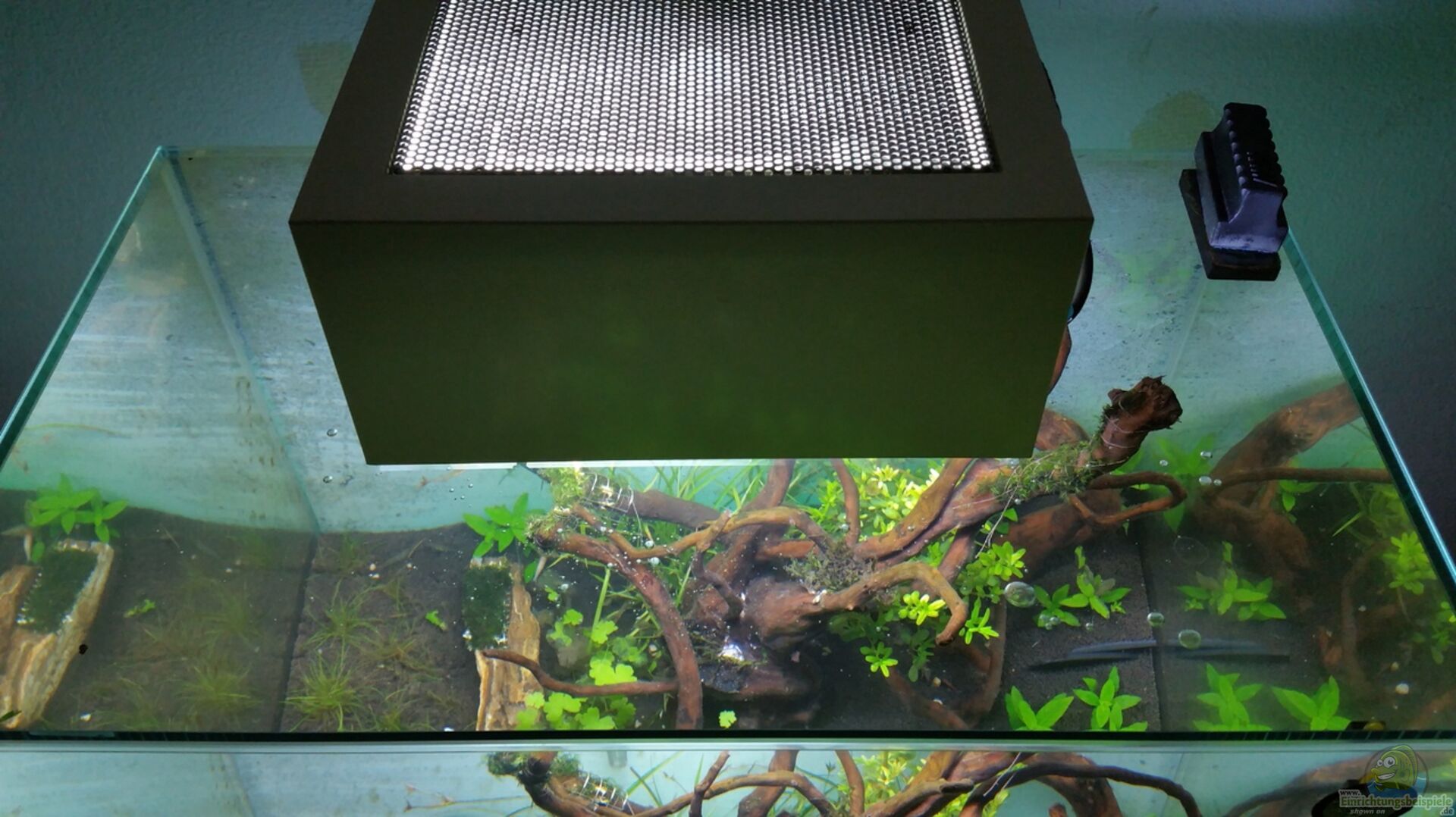 Fluval Edge II Sunriser 8 mit Wolken/Regen/Gewitter/Mondsimulation insgesamt befinden sich 6x 20 cm Ledleisten über dem Becken, in den Farben gelb und rot für Sonnenaufgang und Untergang und 3 Lampen mit Tageslicht für die Wolkensimulation, blau für die Mondsimulation nach den echten Mondphasen. Alle Leisten sind an dem Orginal Lampenarm befestigt.