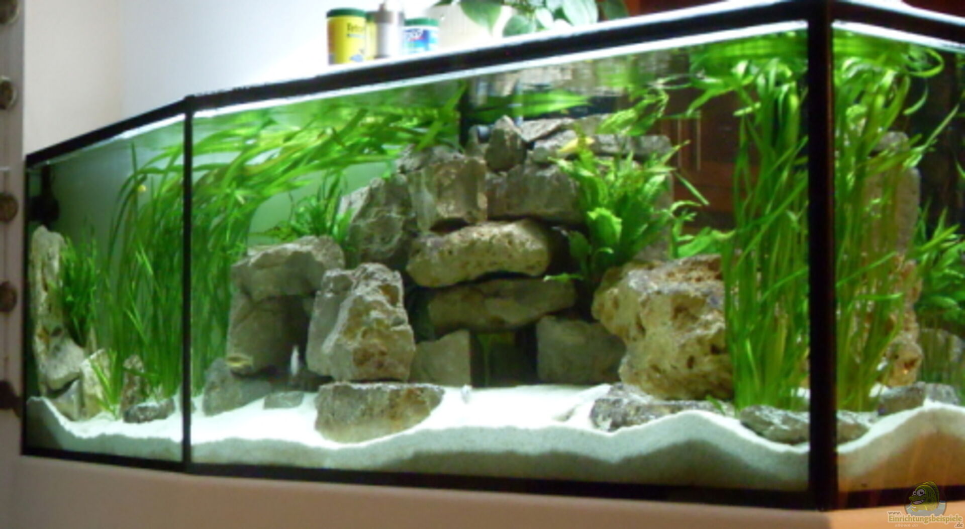 ein etwas anderes Aquarium ( Form ) Sonderanfertigung vom Aquarienbauer in der Nähe . Die Scheiben sind aus 12mm Floatglas und Wulstverklebt ( Nähte innen mit Glasstreifen abgedeckt ). Der Unterschrank ist ein Eigenbau aus Spanplatten und Ytong-Steinen , verkleidet mit Gipsplatten (grün) , nach dem verspachteln mit Streichputz gestrichen und zum Teil mit Antik-Bruchsteinen verkleidet. Die Beckenform hat sich nach langem planen so ergeben und hat sich gut in die Wohnung eingefügt . ===================================================== [...]