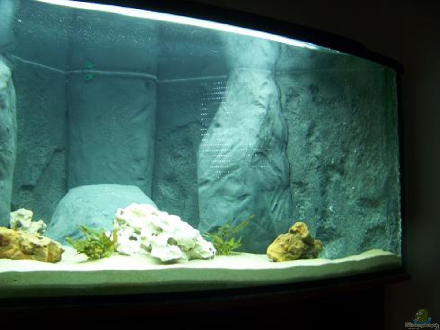 selbstgebaute Rückwand mit gro??en Felsen (Fliesenkleber mit Putzmatte), die Steine wurden 6 Wochen gewässert. ph Wert ist jetzt stabil!
