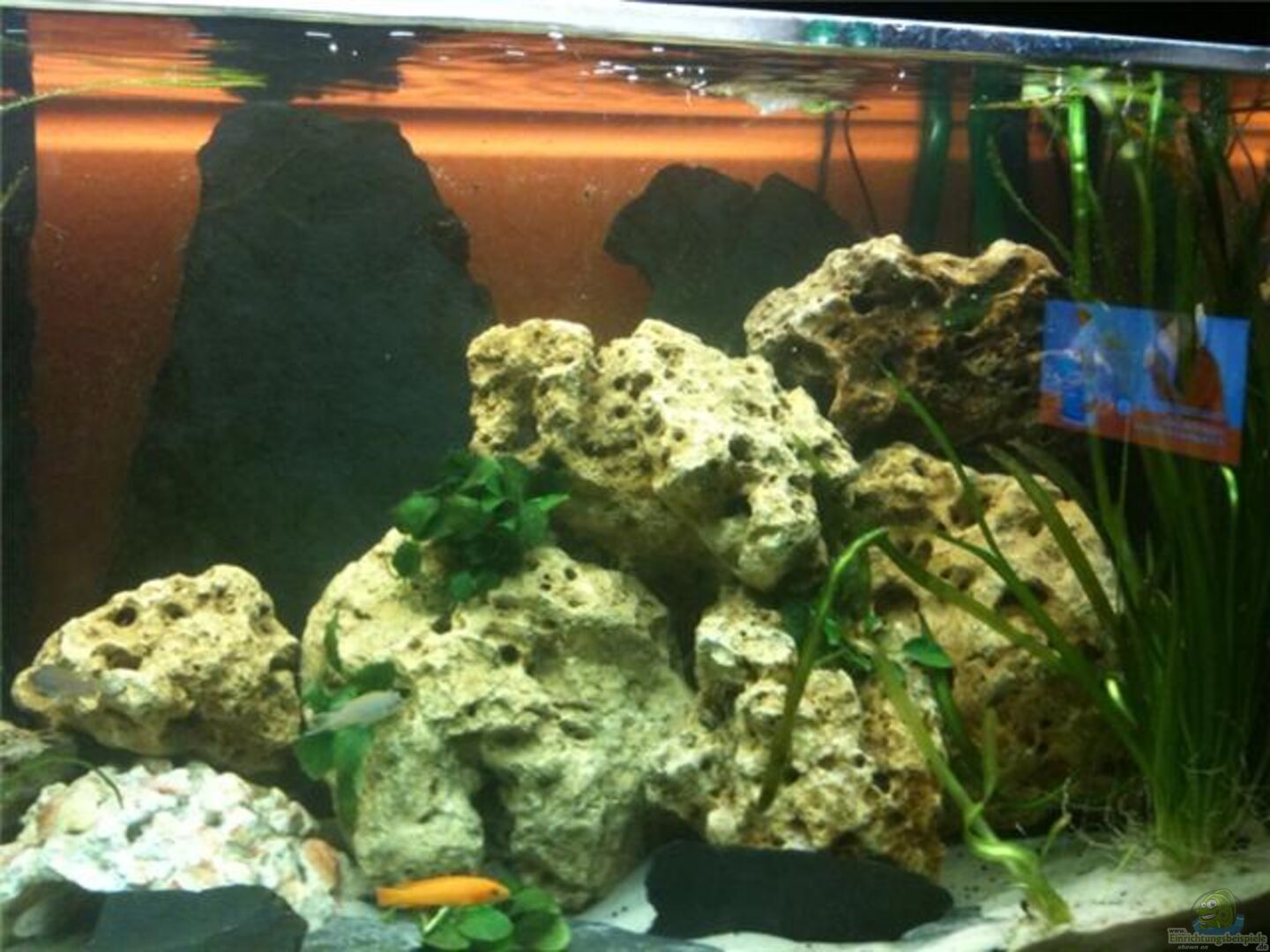 2 gro??e Valisneria gigantea die gut wachsen und auch mehere ausleger schon verteilen. mehere auf den steinen verteilte anubias. einen teppich mit javafarn und javamoos auf dem lochgestein noch sehr klein aber vermehrt sich Efeututen die über dem Becken wachsen und Ihre Energie aus dem Aquariumwasser beziehen.