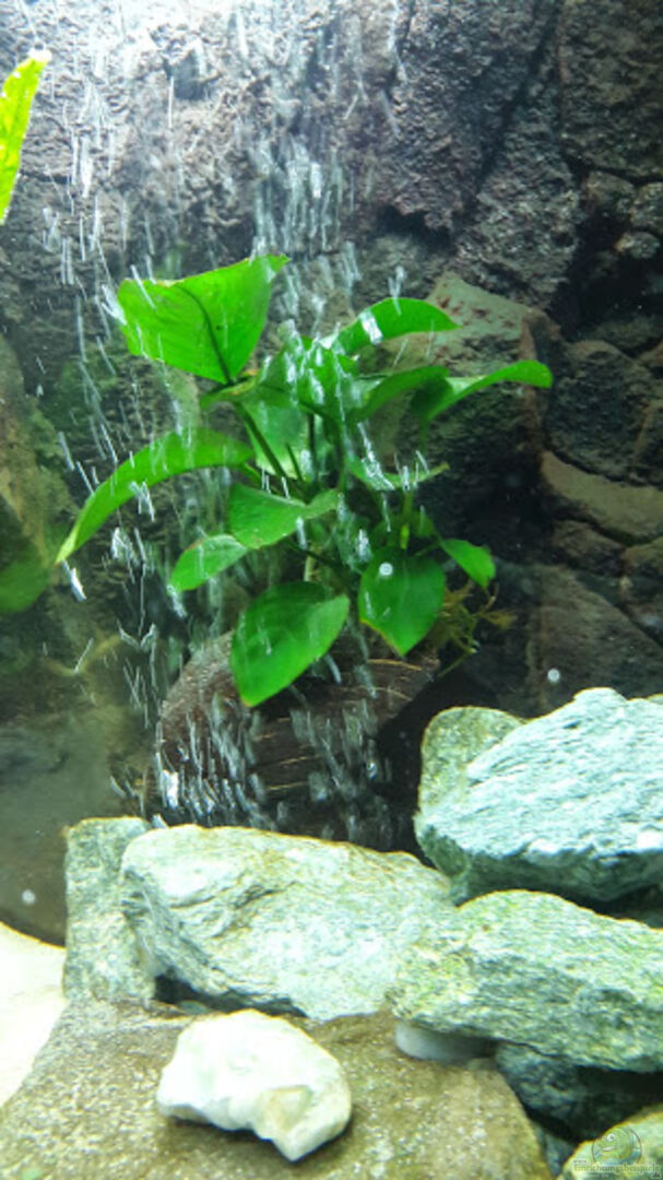 Folgende Pflanzen von Dennerle befinden sich im Becken: 1* Microsorum pteropus (Javafarn). Diese Pflanzen habe ich in der Hoffnung gewählt, dass sie von meinen Buntbarschen nicht gefressen werden, sie sollen zudem mein Aquarium verschönern und lebhafter machen, Die Pflanze habe ich auf einen Stein gebunden, welcher ich auf die Sandbank gesetzt habe. 1* Anubias barteri (auf ausgehölte Kokosnuss gebunden) 1* Echinodorus Dschungelstar Nr. 3 Python