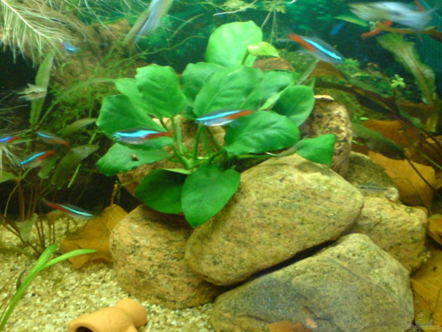 Vor der Rückwand liegt eine flache hohe Wurzel die mit Christmasmoss bepflanzt ist. Vorne links eine Wurzel mit Javafarn. Weiterhin habe ich noch braunen, gewellten Wasserkelch, Amazonaszwergschwertpflanze und ne Anubia nana aufm Steinhaufen drin. Massig Schwimmpfalnzen sind drin: Hornkraut, brasilianischer Wassernabel und Froschbiss.