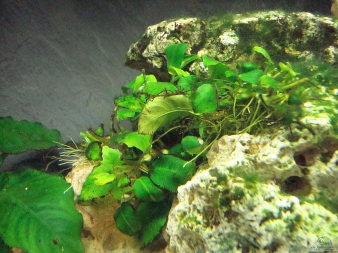 Hauptsächlich Anubien wie Anubia nana und Anibia barteri die ich in freie Stellen zwischen den Steinen befestigt habe. Im linken Beckenteil ist im Hintergrund eine Crinum thaianum zusehen, durch ihr langen Blätter bringt sie etwas Dunkelheit ins Becken und bietet Versteckmöglichkeiten für Jungtiere. Im Vordergrund sind als Revierabgrenzun zwei Echinodorus bleherae die im Moment noch eher klein sind aba schon kräftig anfangen zu wachsen^^