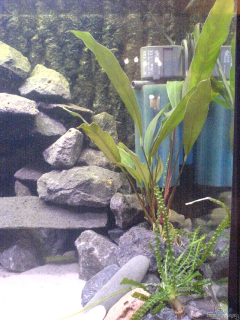 Anubias nana 4 Stück, an und zwischen Steinen befestigt. Anubias nana 1 mal an Seitenwand befestigt Anubias afzellii (soll Filter verdecken) Crinum calamistratum (soll ebenfalls Filter verdecken) Cryptocoryne aponogetifolia Düngung mit Sera florena (14 tägig laut Packungsangaben)