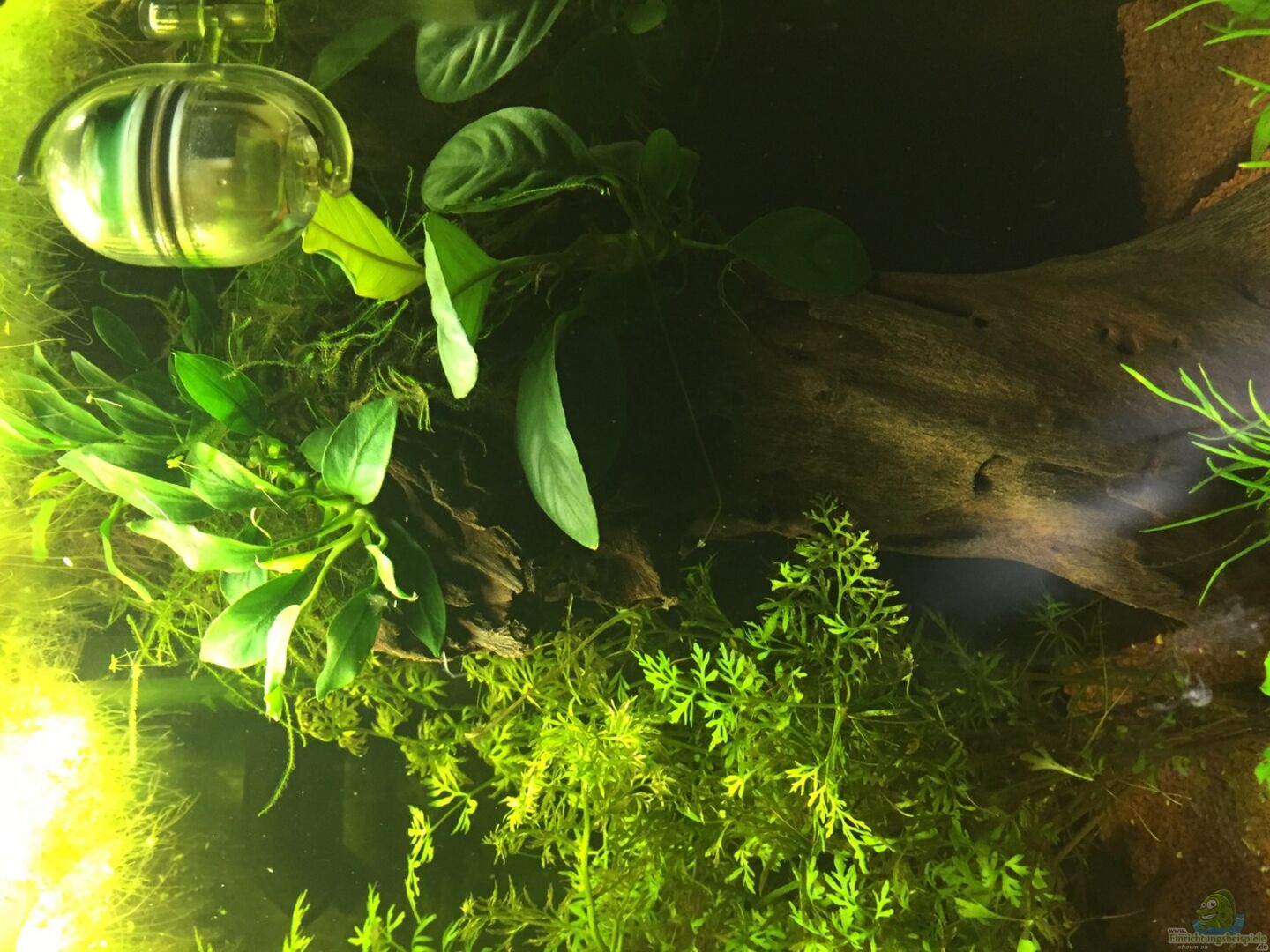 Auf Wurzeln und Kokosnussschalen: - Bolbitis het. difformis - Anubias nana Bonsai - Anubias barteri var. nana - Anubias coffeifolia - Bolbitis heudelotii Im Hintergrund: - Nyphaea lotus rot - Ceratopteris cornuta Im vorderen Bereich: - Eleocharis parvula - Marsilea hirsuta - Lilaeopsis mauritiana - Lagenandra meeboldii rot Schwimmpflanzen: - Ceratopteris cornuta - Wasserlinsen - Kleiner Schwimmfarn