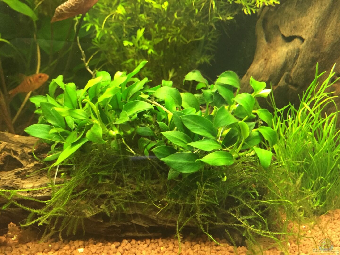 Auf Wurzeln und Kokosnussschalen: - Bolbitis het. difformis - Anubias nana Bonsai - Anubias barteri var. nana - Anubias coffeifolia - Bolbitis heudelotii Im Hintergrund: - Nyphaea lotus rot - Ceratopteris cornuta Im vorderen Bereich: - Eleocharis parvula - Marsilea hirsuta - Lilaeopsis mauritiana - Lagenandra meeboldii rot Schwimmpflanzen: - Ceratopteris cornuta - Wasserlinsen - Kleiner Schwimmfarn