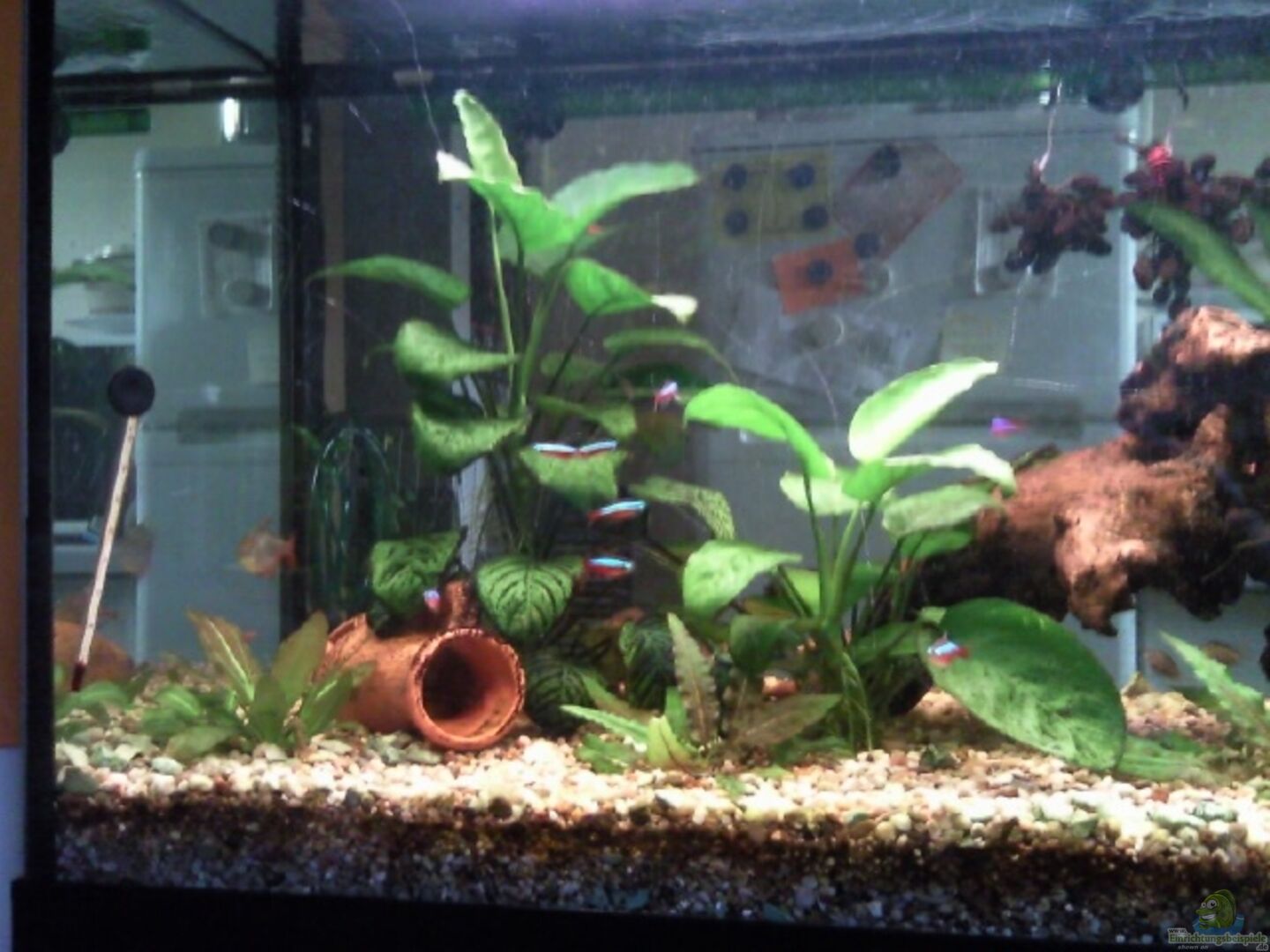 Anubias Barteri, Echinodorus Bleherie- Amazonas schwertpflanze gro??, Wend`s Wasserkelch [genaue Sorte kenne ich nicht], kleine Rosettenpflanzen 2Stück Echinodorus Rainers Kitty, Sind alles Mutterpflanzen und Ableger aus einem 80er Aq. das ich als mein erstes von meinem Opa geerbt hatte.2x rotes Papageienblatt, 2x schmalblättriges Papageienblatt, 3x feines Sumatrafarn, 2x was ich für rote Ludwiegien halte habe ich neu dazugepflanzt. Au??erdem habe ich verschiedene steine mit Javamoos umbunden [...]