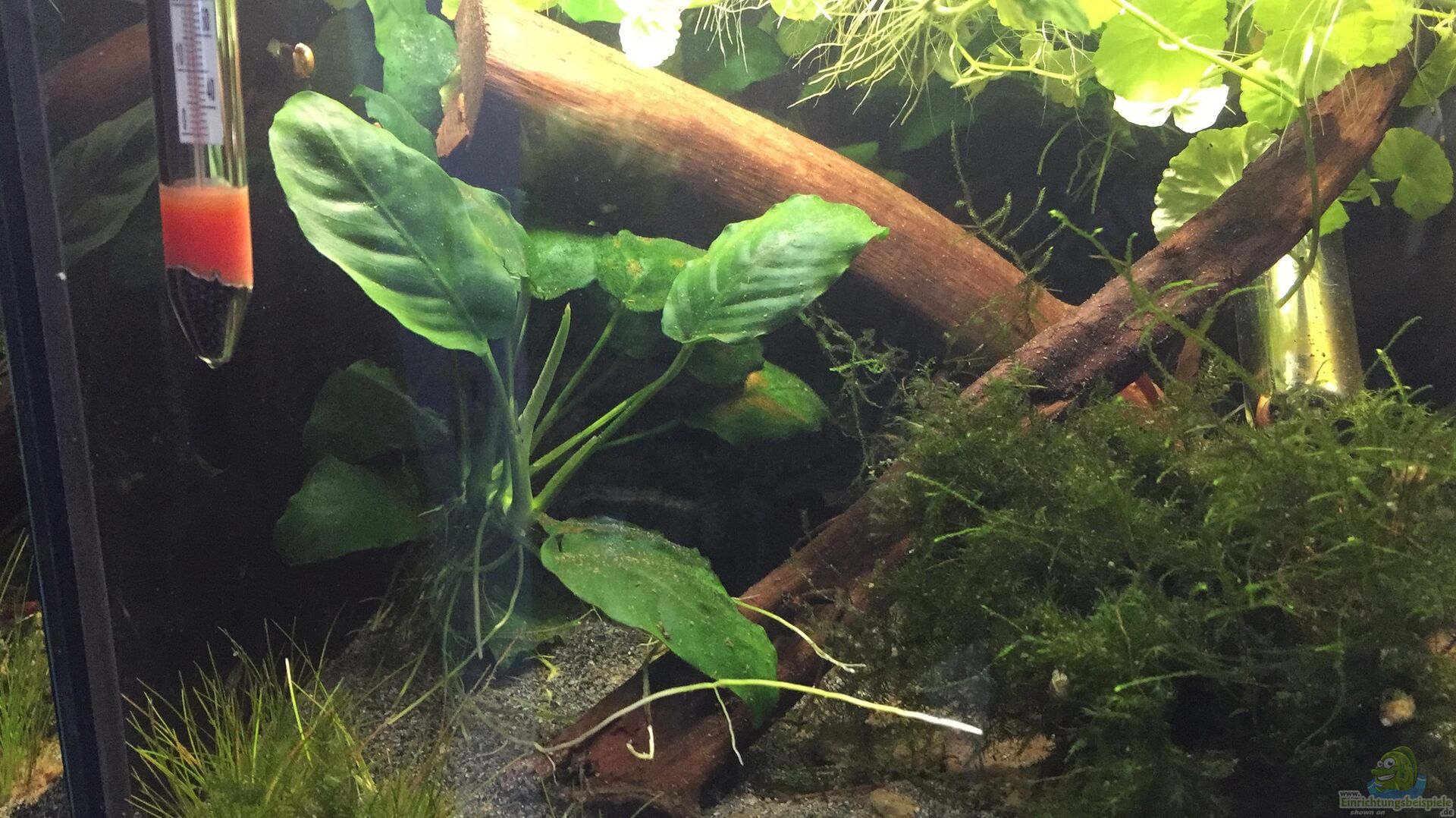 Ziel der Bepflanzung ist es den Kampffischen viel Rückzugs- und Ruheräume bereitzustellen. Bei der Pflanzenauswahl habe ich mich auf pflegeleichte Arten beschränkt, die mit wenig Licht auskommen: Anubias barteri var. nana (Zwergspeerblatt) Hydrocotyle leucocephala (Brasilianischer Wassernabel) Fissidens fontanus (Quellenliebendes Spaltzahnmoos) Taxiphyllum barbieri (Javamoos) Pistia stratiotes (Muschelblume)