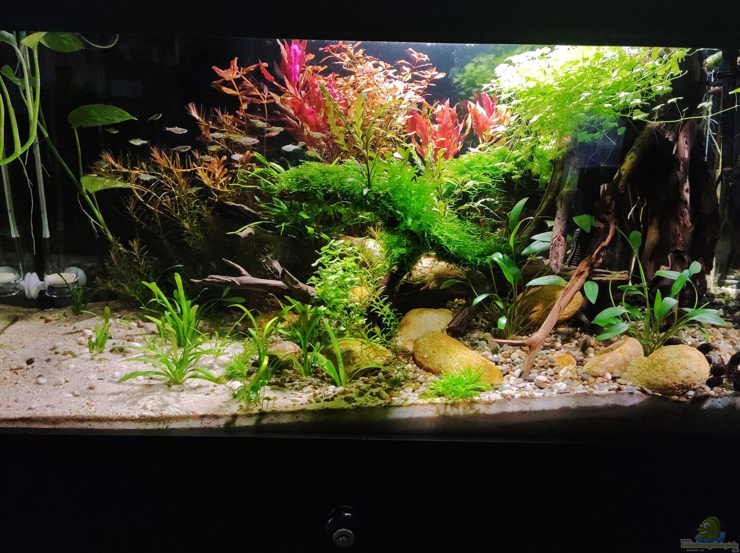 Das Becken wird mit einem Oase Filter 100 gefiltert. Eine 200 Watt Heizung sorgt für ca. 24-25 Grad. Eine CO 2 Anlage ist installiert. Der Schrank ist Marke eigenbau und mit Styropor isoliert. Das besteht aus 2 fluval Led Leuchtmittel. Diese werden unterschiedlich über eine Steuerung eingeschaltet. Ca 8-10 Stunden wird beleuchtet.