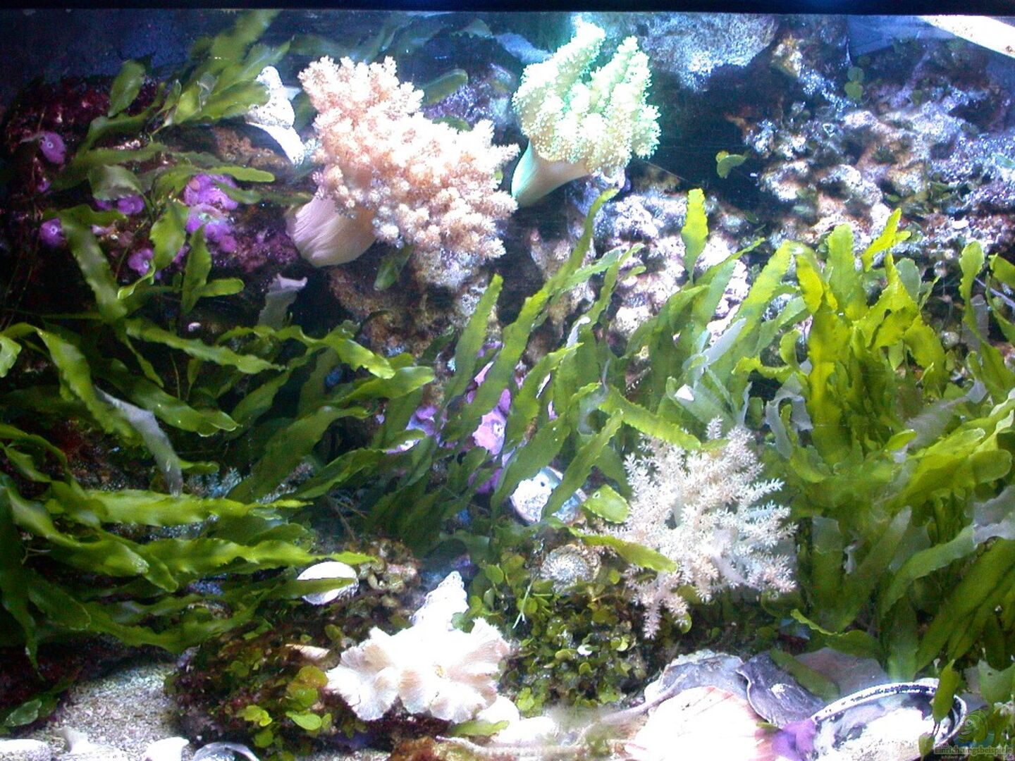 Deltabecken mit Bohrung 50mm und eingeklebtem Rieselfilter 2 Unterbecken 45l Jaubert-Refugium, unbepflanzt 27l Algenbecken parallel mit Caulerpa Prolifera, in dem sich diverse Kleinstgarnelen, Flohkrebse etc. tummeln Becken ´läuft´ seit Juni 2007