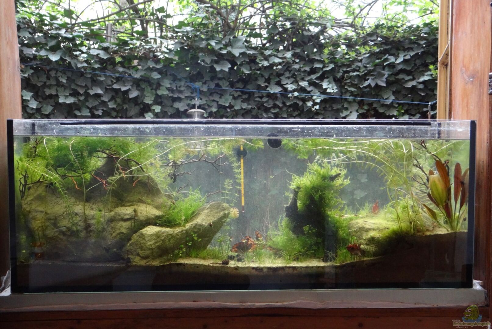 Das Becken ist ma??gefertigt, damit es genau ins Kastenfenster hineinpasst. Da die Fenster schon älter sind, wird das Aquarium sowohl jahreszeitlichen wie auch täglichen Temperaturschwankungen unterliegen.