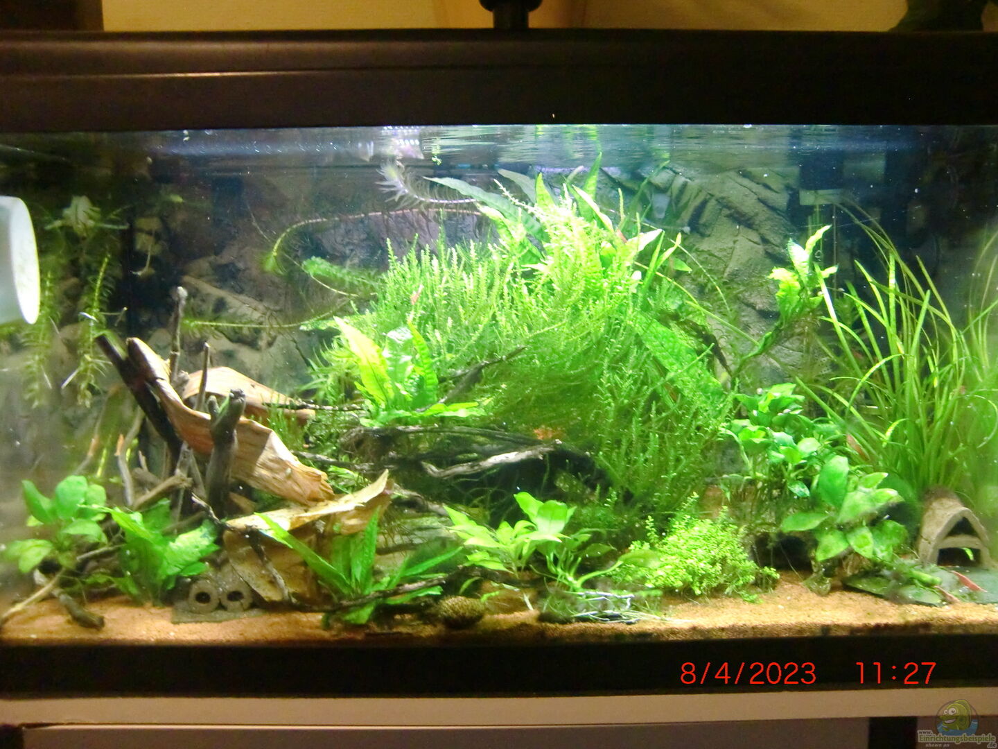 Standardbecken, stand im Keller, gereinigt und neu aktiviert steht in meinem Büro/Männerzimmer im Keller auf einem Alu-Gestell eines 1 Meter Beckens, dieses habe ich verkauft auf Grund der gestiegenen Energiepreise und da ich keine Abnehmer für meine ständigen Sajicas hatte Für da Becken habe ich nur Deko, Pflanzen und Besatz gekauft, Hardware sind Restbestände aus dem Keller Rückwandfolie in Steinoptik