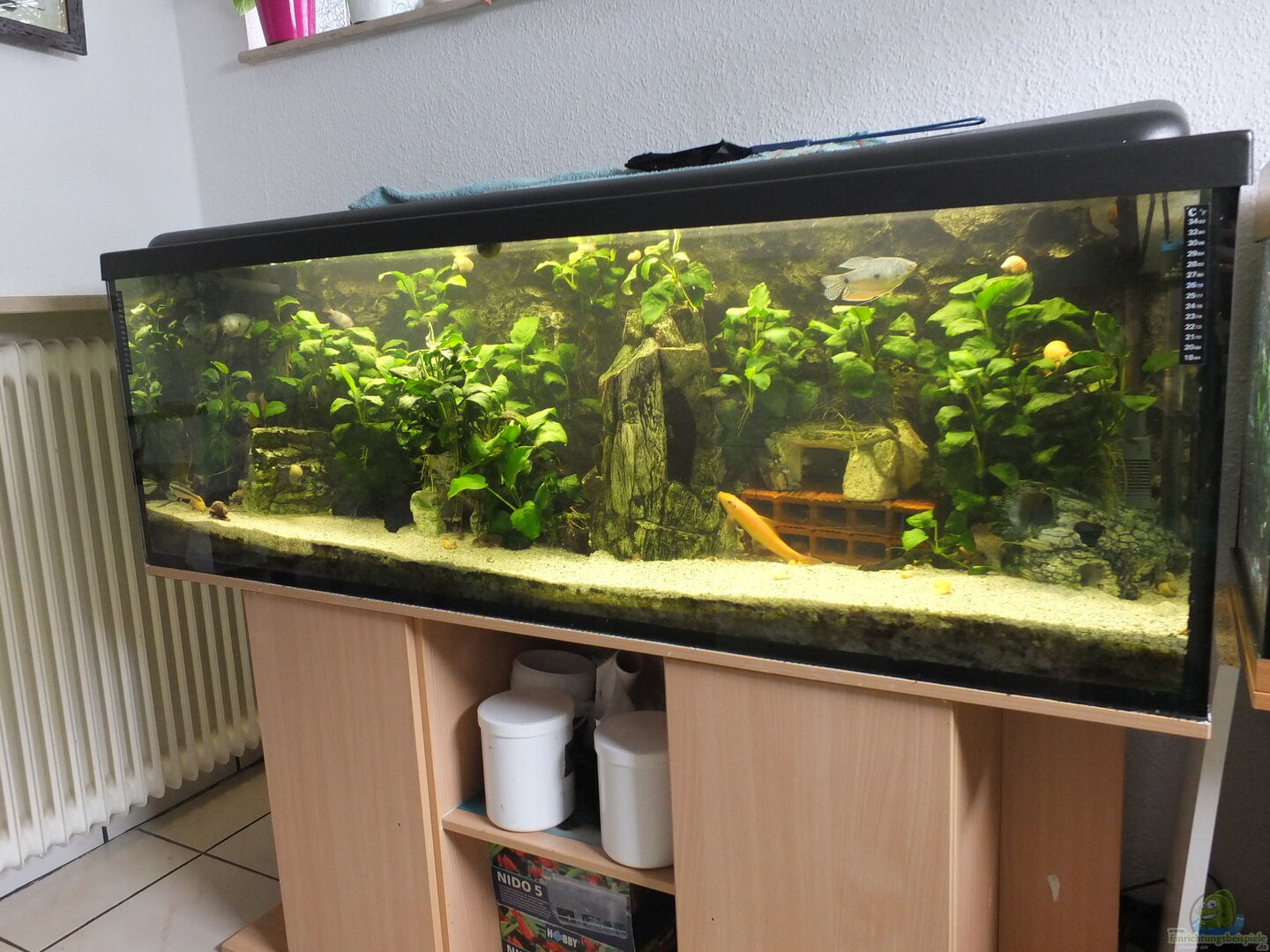 Ganz normales Becken gebraucht gekauft und mit Silikon verklebt und hat oben so eine mittel steg aus glas eingeklebt und rings herrum auch so glasstege um abdeckscheiben drauf legen zu können ....habe ich aber nicht gemacht sondern nur so die beleuchtungsabdeckhabe drüber gestülpt Das Becken steht auf einem Unterschrank aus Holz mit 2 Türen und einem offenen Mittelfach habe ich selber weiss lackiert bzw mit Folie beklebt und die Technik alles im Schrank und dann durch die löcher nach hinten [...]