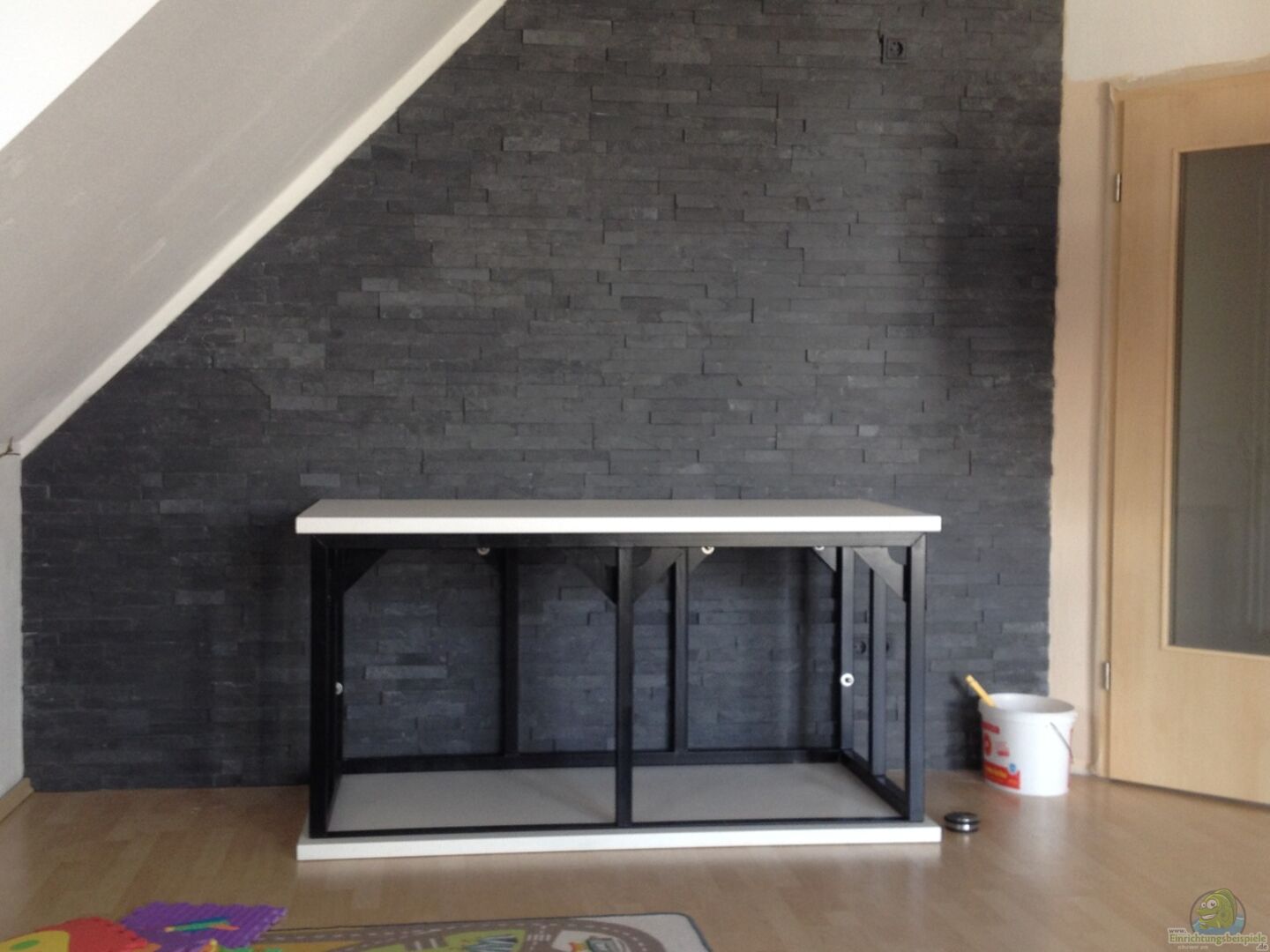 Becken von Brillant-Aquarium, 12mm Glasstärke, eine Querverstrebung, Wulstverklebung und wei??e Kiesblende. Die Abdeckung ist von Aquarienabdeckungen Runge (www.aquarienabdeckungen.com) und verfügt über 3 Klappen sowie 5 Bohrungen auf der Rückseite für Schläuche, Kabel etc. Die Unterkonstruktion ist selbstgebaut auf Stahl. Unter der Stahlkonstruktion befindet sich eine 4cm Küchenarbeitsplatte, ebenso zwischen Becken und Unterbau. Zudem wurde das Becken mit Schwerlastverankerungen [...]
