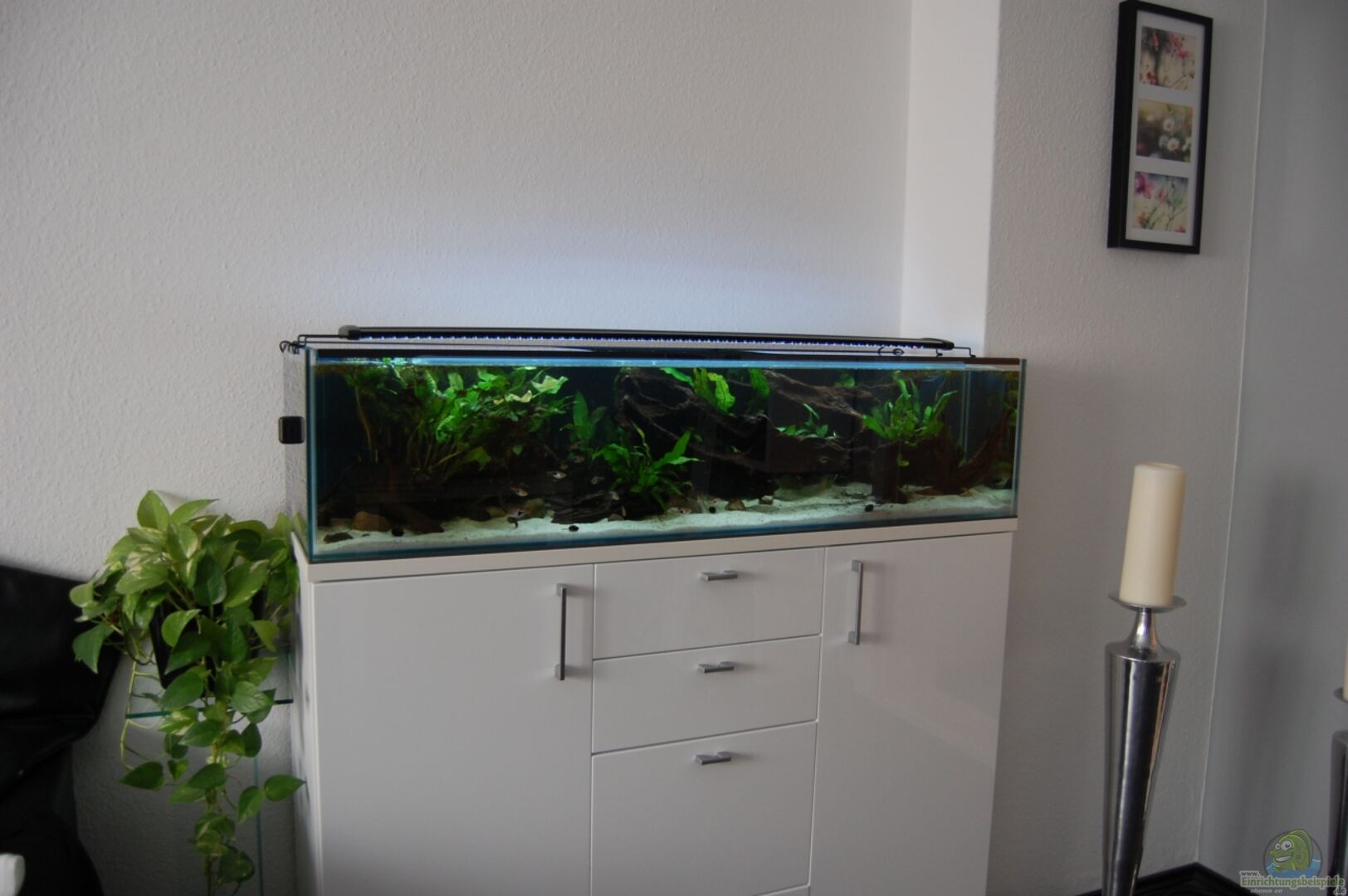 Wieder einmal handelt es sich bei dem Becken um eine Sonderanfertigung, die diesmal passend zum Sideboard gefertigt wurde. Hersteller ist die Firma Aquarienbau Voigt in Werneuchen bei Berlin. Das Becken wurde aus 8mm starkem Floatglas gefertigt und mit transparentem Silikon geklebt. Passgenau dazu habe ich mir eine dreiteilige Glasabdeckung von der Fa. Voigt anfertigen lassen, welche in zwei Kunststoff-E-Profilen auf der gesamten Beckenlänge verschiebbar ist. Als zusätzlichen Service wurden mir [...]