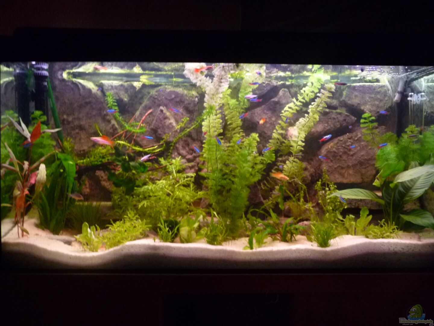 Ansich hat es keine Besonderheiten, das einzige ist die Rückwand und ein teil des Bodens. Es ist aus Styropor und Kunststoff angefertigt und mit Grauerfarbe gestrichen. Am Boden wurden damit 3 Hölen angefertigt. Die Struktur der Rückwand soll eine Fels (Stein) wand darstellen. Der Aquarienschrank wurde selbstgebaut aus Fichtenholz. Er hat 2 Türen (links und rechts)