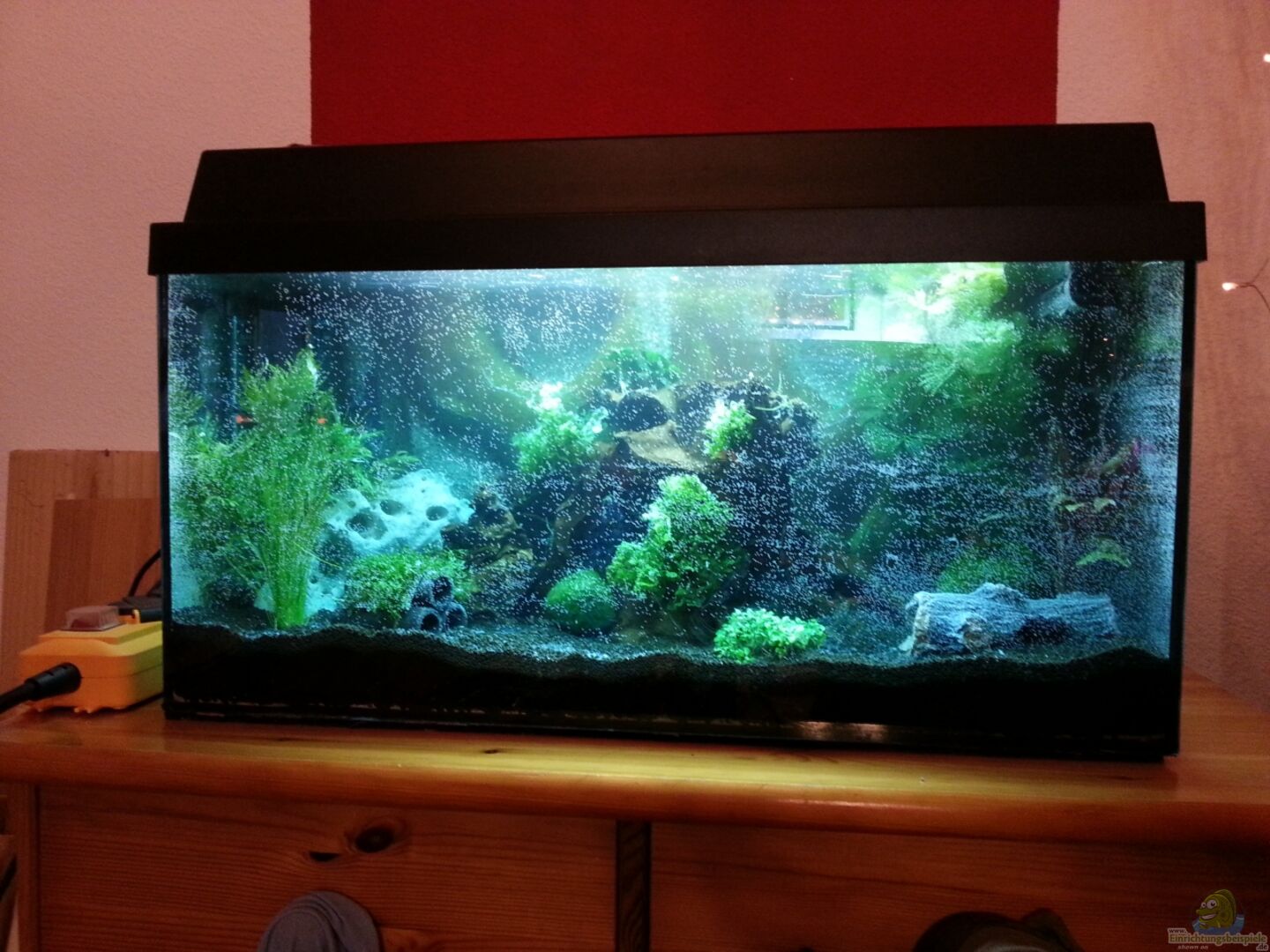 Das Becken ist ein Standardbecken 54 Liter. Die Rückwand ist komplett selber gebaut aus einer 80 mm Styroporplatte, teilweise hinterschwimmbar und hat viele kleinere Höhlen. Die Platte ist dann ins Becken eingearbeitet wurden. Ausgearbeitet und mit Kies und Epoxidharz dunkelgrün und braun versiegelt