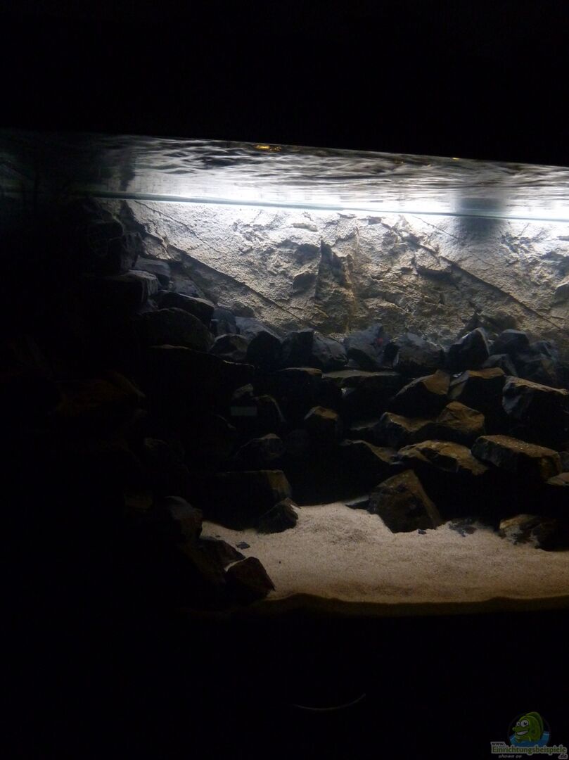 Bohrungen für den Filter Ein- und Auslauf. Die seitlichen Scheiben sind mit einer schwarzen Folie abgeklebt, da sonst Licht von aussen in die Höhlen kommen würde. Zwischen dem Aquarium und dem Untebauschrank ist eine 1cm Dicke Styroporplatte, um das Gewicht gleichmässiger zu verteilen. Zudem ist der ganze Boden im Aquarium mit einer 2cm dicken Styorporschicht ausgelegt, auf der dann auch die Steine aufliegen.
