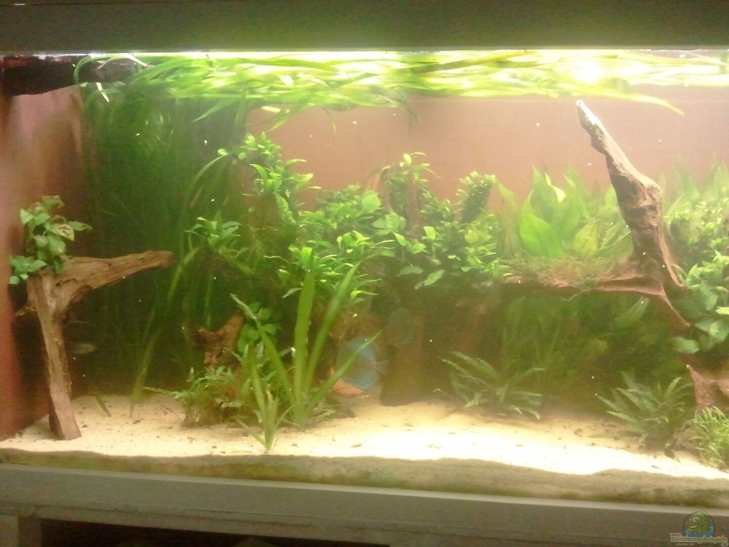 Holzaquarium Marke Eigenbau. Becken, Beleuchtung sowie Unterschrank sind selbstgebaut. Besonderheit ist neben dem Werkstoff der innen liegende Kabelkanal. Seitliches Profil ist ein Trapez, Rück- und Seitenwände sind bewusst höher als die Front, Ziel war Spritzschutz und Anbringung der Abdeckung.