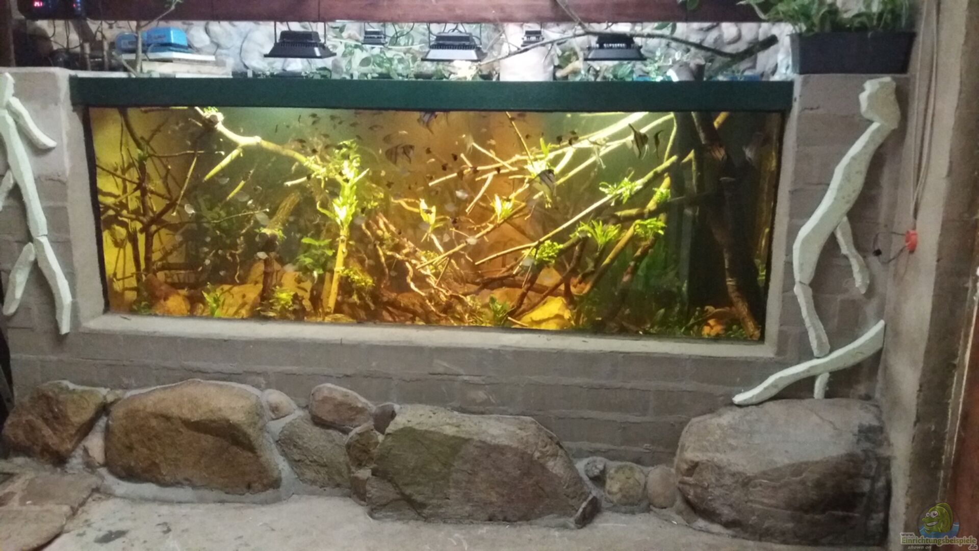 Das Auqarium wurde aus Kalksandsteinen gemauert, mit Dichtschlämme und anschlie??end Impermax abgedichtet. Alles wurde in kompletter Eigenleistung gebaut. Die Aquarienscheibe hat die Ma??e 290 cm x 100 cm, bestehend aus 2 x 15 mm VSG (Verbundsicherheitsglas) + 1, 52 mm Folie und wiegt rund 220 kg. Im oberen Bereich der Scheibe befindet sich ein Stahlträger. Für dieses Aquarium wurde extra ein passender Raum noch mit am Haus angebaut (Haus ist komplett unterkellert, ging also nicht [...]