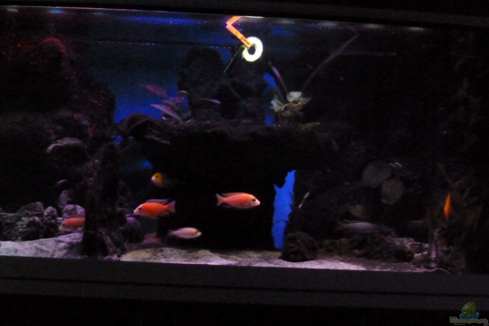 Meine Frau und ich betreiben dieses herrliche Hobby gemeinsam! Aquarium gebogene Frontscheibe Floatglas 12 mm, Druckverklebung, Sicherheitsnaht, 10 Jahre Garantie auf Dichtheit, 2 Längs- und eine Querstrebe, eingeklebter blauer Aquarienhintergrund, 3 Kammer-Innenfilter links, linke Seitenwand wurde von au??en mit schwarzer Fensterfolie beklebt. Rückwand von au??en mit 2 cm Styroporplatte isoliert. [...]