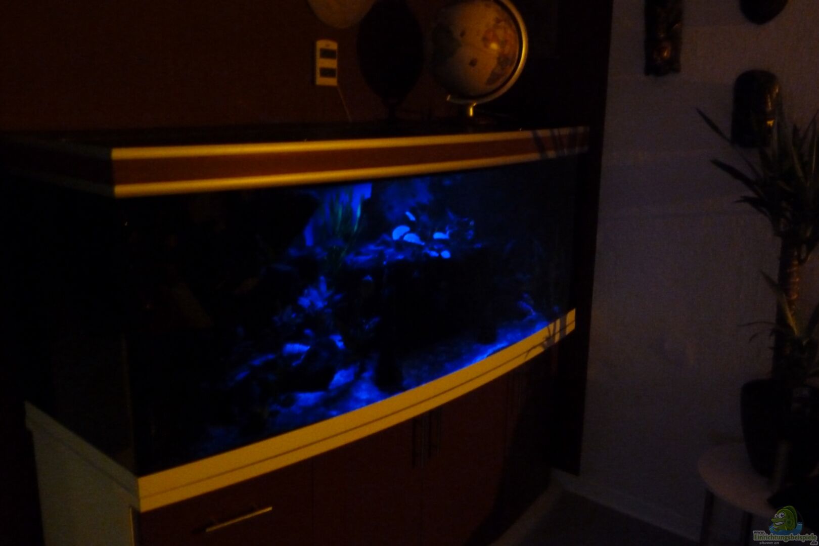 Meine Frau und ich betreiben dieses herrliche Hobby gemeinsam! Aquarium gebogene Frontscheibe Floatglas 12 mm, Druckverklebung, Sicherheitsnaht, 10 Jahre Garantie auf Dichtheit, 2 Längs- und eine Querstrebe, eingeklebter blauer Aquarienhintergrund, 3 Kammer-Innenfilter links, linke Seitenwand wurde von au??en mit schwarzer Fensterfolie beklebt. Rückwand von au??en mit 2 cm Styroporplatte isoliert. [...]