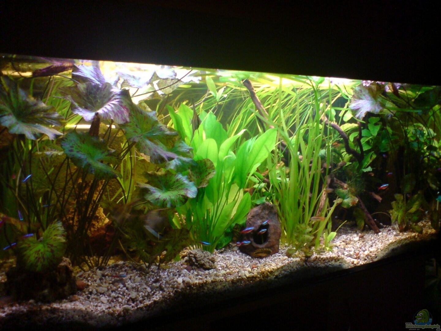 Aquarium Rückwand: Bestehend aus Kork und mit einem dunklen Braunton (Erdfarben) bestrichen. Diese dann im Abstand zum Aquarium von 5cm dahinter angebracht. Das hat einen bestechenden Tiefen Effekt zur Folge.